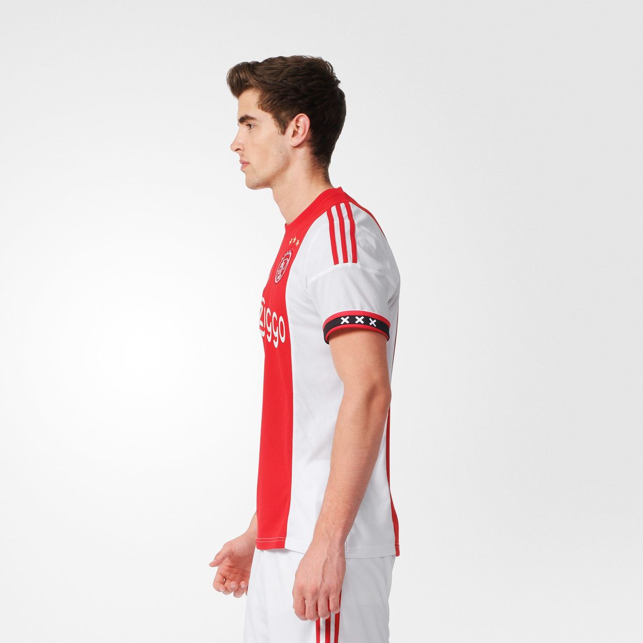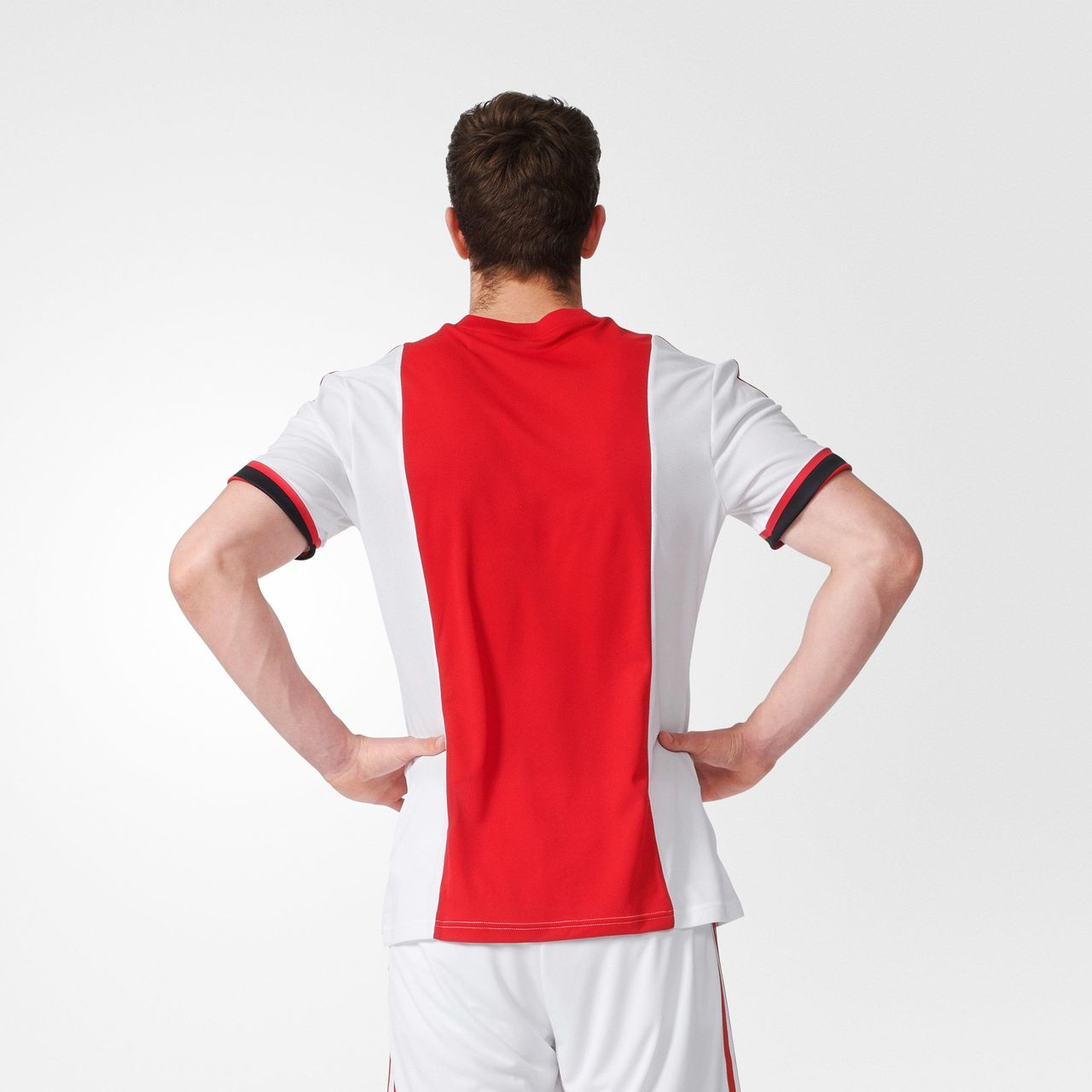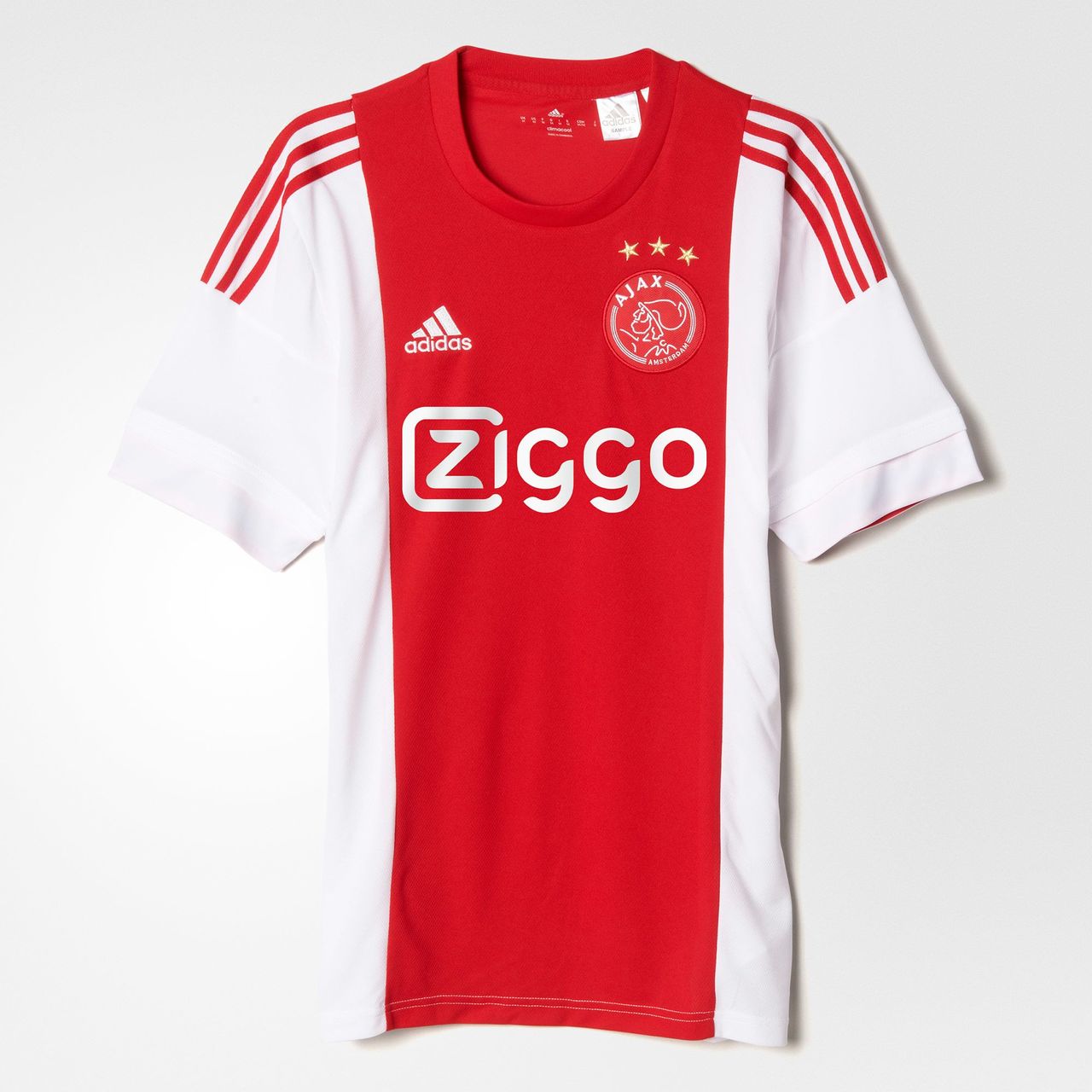 In keeping with the traditional and world famous Ajax look, the shirt is white with a simple red panel/stripe running vertically down the centre of the front, housing the badges and sponsor's logo.
