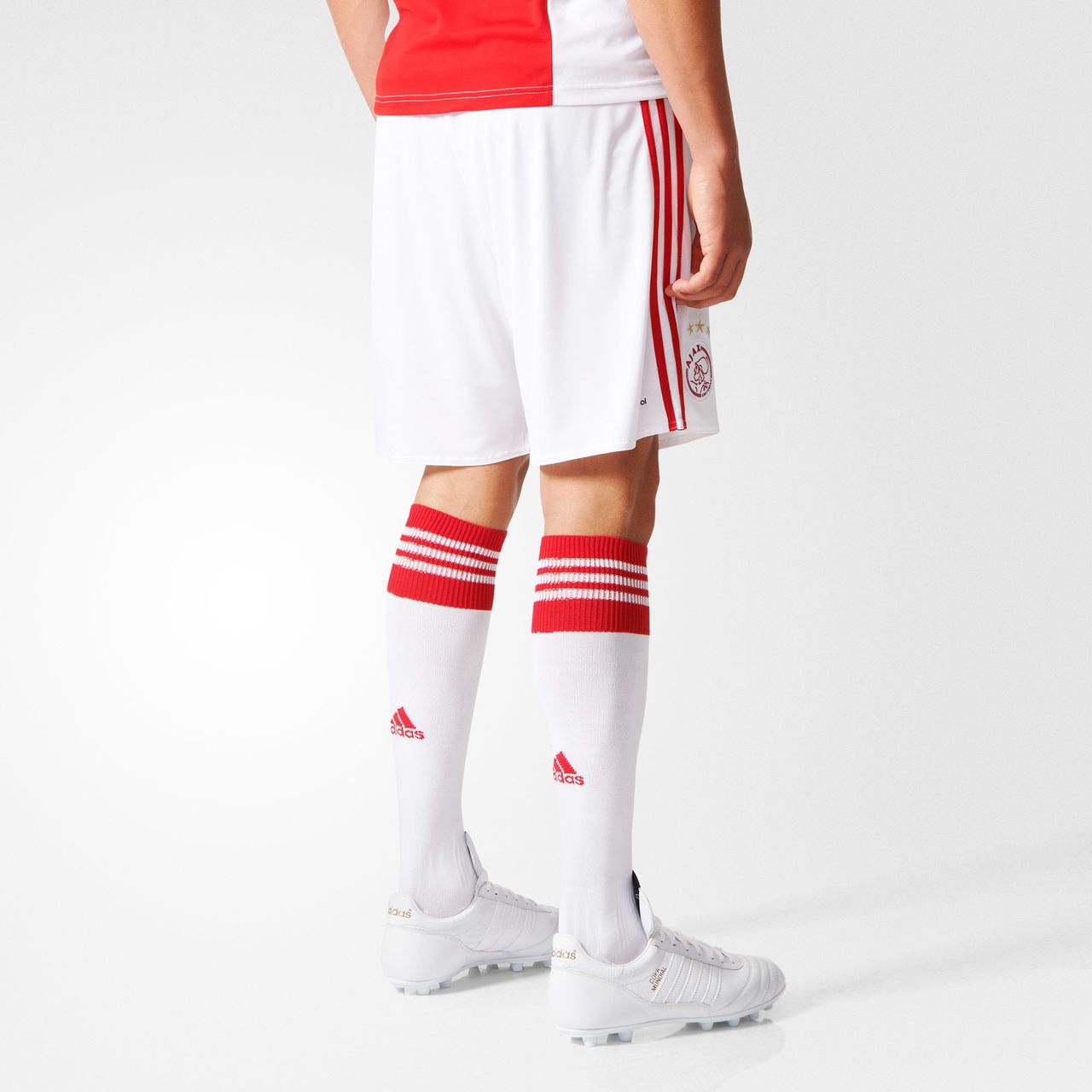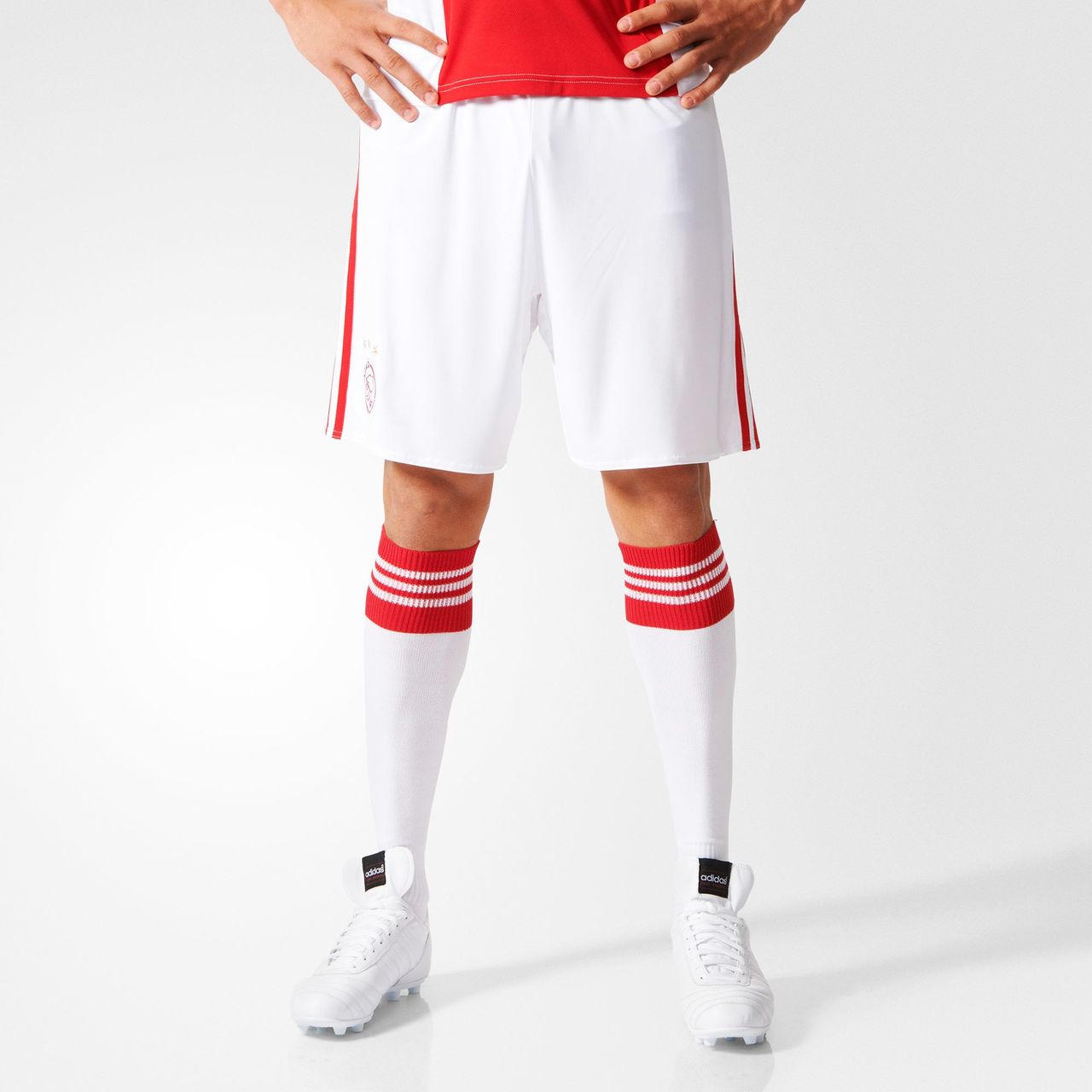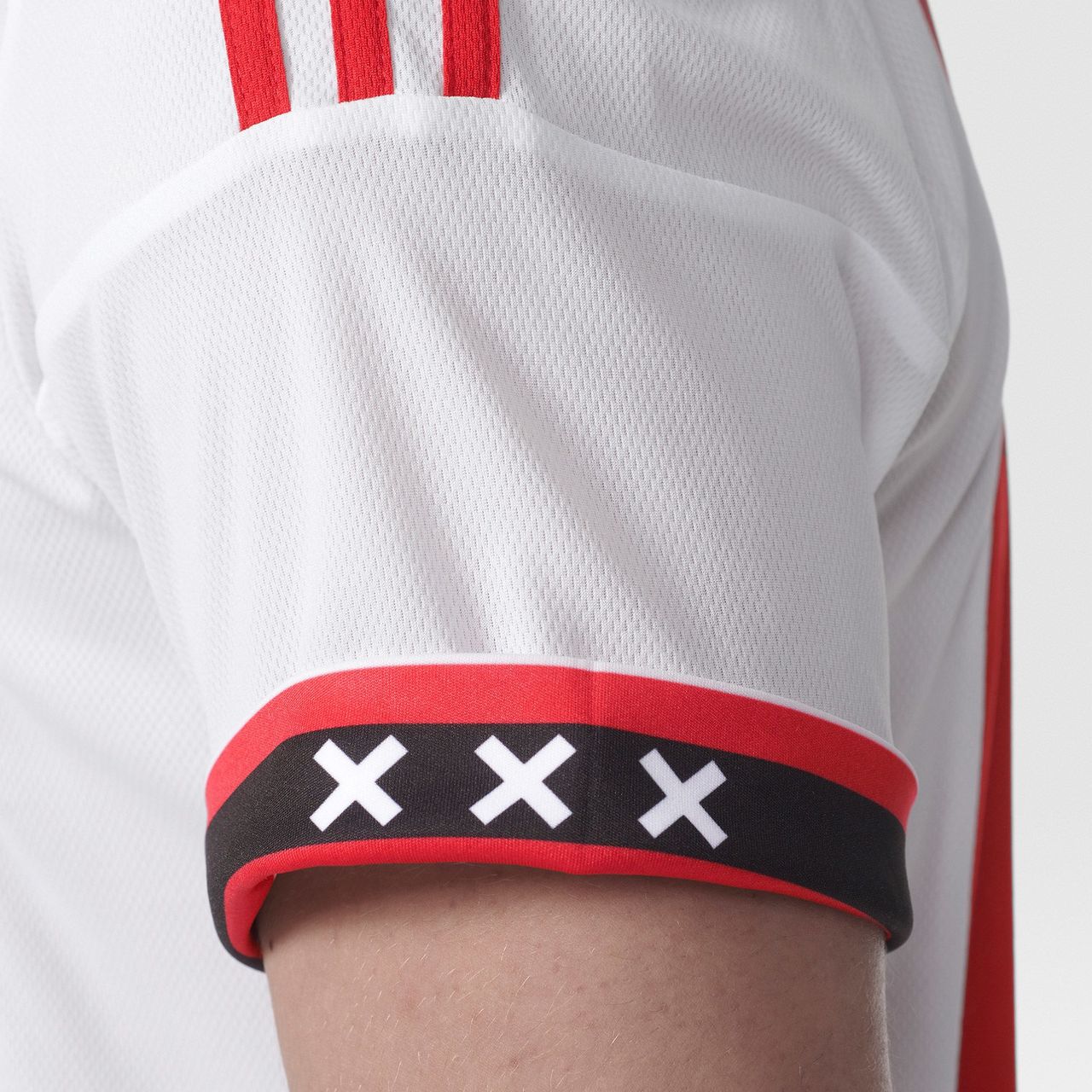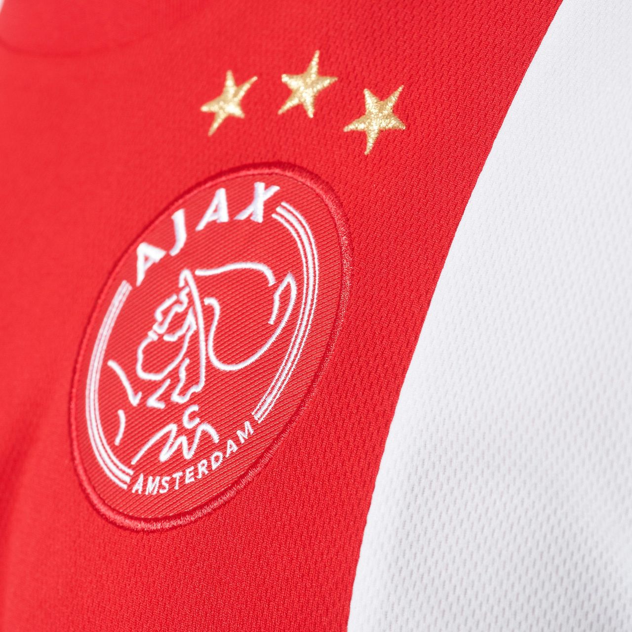 In keeping with the traditional and world famous Ajax look, the shirt is white with a simple red panel/stripe running vertically down the centre of the front, housing the badges and sponsor's logo.