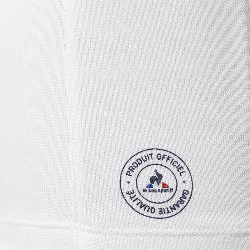 The bottom of the jersey also features an authentic touch, the text «Produit Officiel - Garantie Qualité» («Official Product - Quality Guarantee»), a reference to le coq sportif’s origins in the knitwear industry. Early on, the factory supervisor would stamp all the products as certified compliant before they were released from the plant.