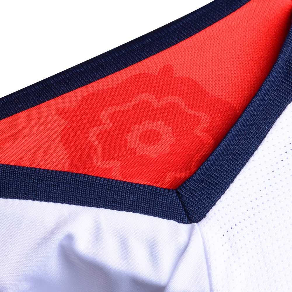 The new shirt, manufactured from Macron’s MPerformance System fabric, features a specially designed collar and neckline, that together with a navy blue and red trim encompasses the club’s Lancashire rose.