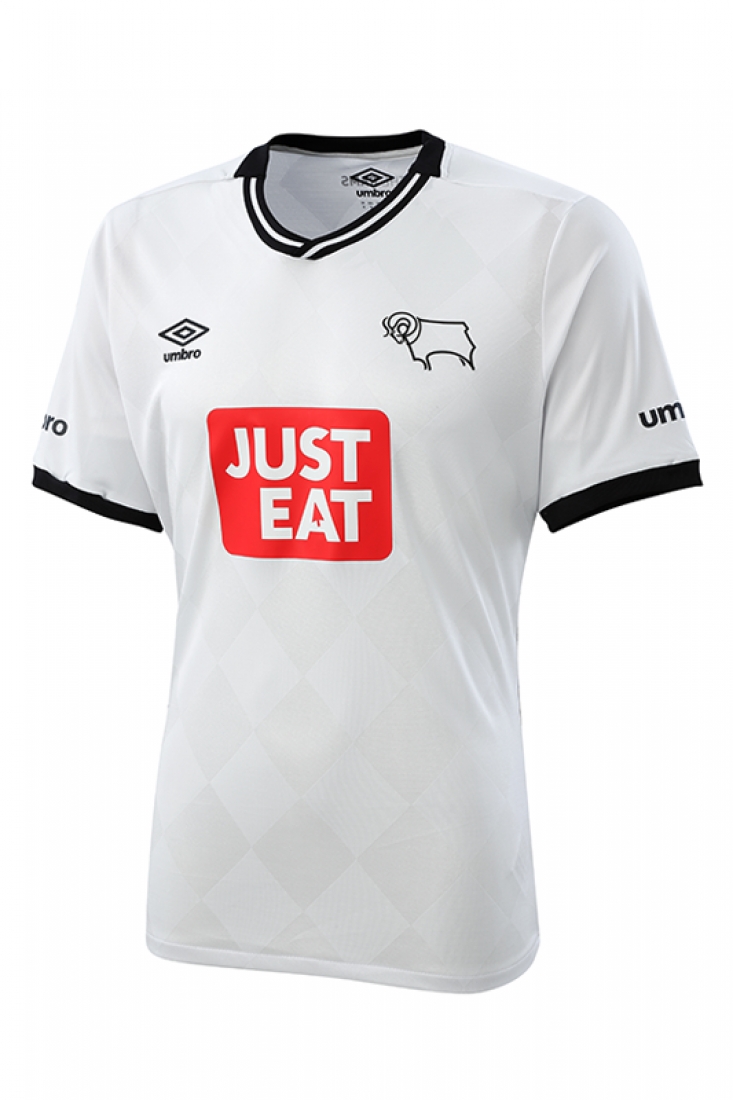 The neck line is inspired by Derby's 1970 home shirt, brought up to date with a contemporary flat knit v-neck rib, with a black and white stripe.