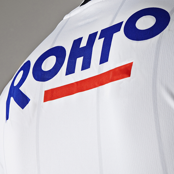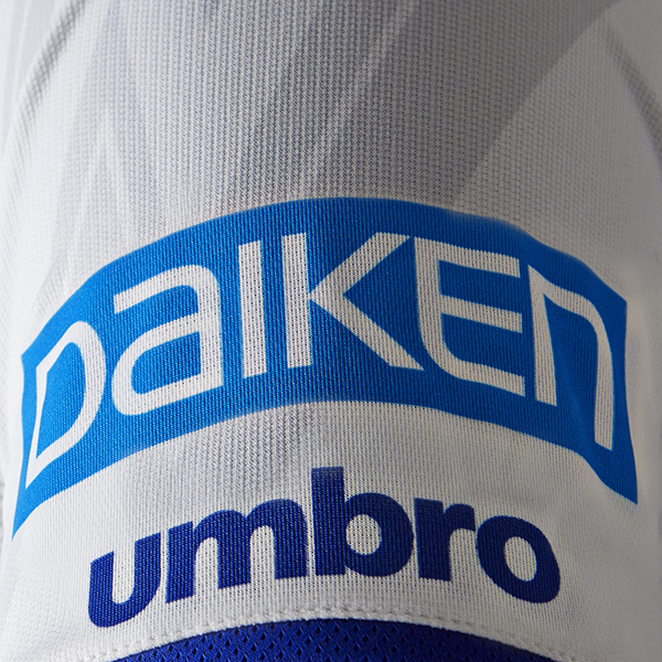 The new Umbro shirt is white and features a blue and black diagonal sash effect. This colouring is repeated on some neat details on the hybrid V-neck/roundneck collar and the cuffs.