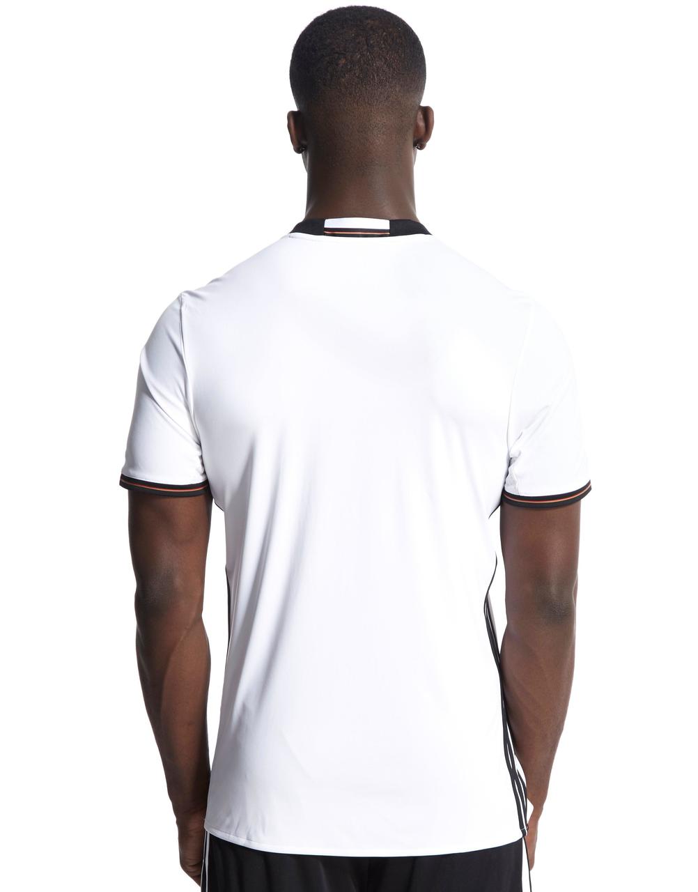 This is the new Germany 2016 Home Football Kit from adidas. In the traditional white colourway this shirt features a simple crew neck collar in black with the colours of the national flag showing to the back.