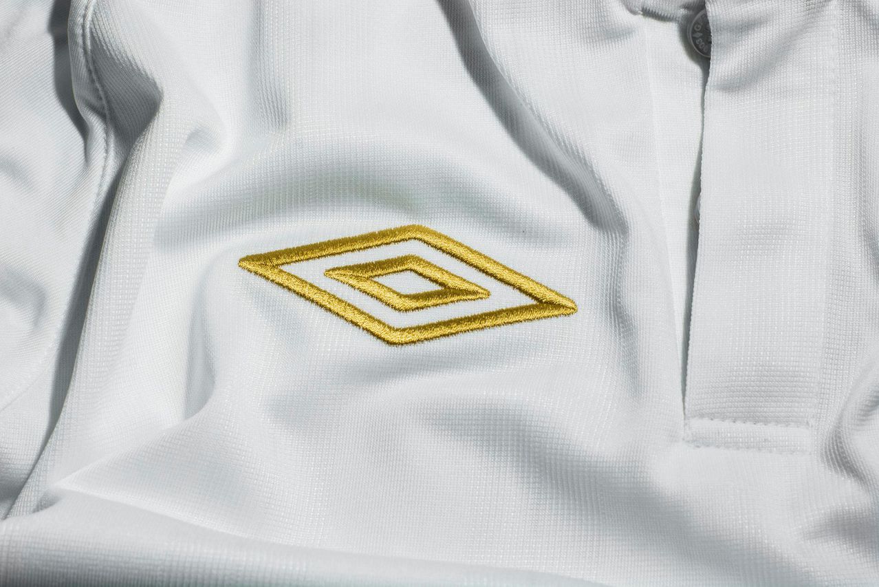 The new Away shirt follows Umbro's trademark combination of classic tailored style with modern ergonomic and performance-focussed technology. The largely white design is complemented with a neat, blue-trimmed grandad-style collar and matching panels on the cuffs.