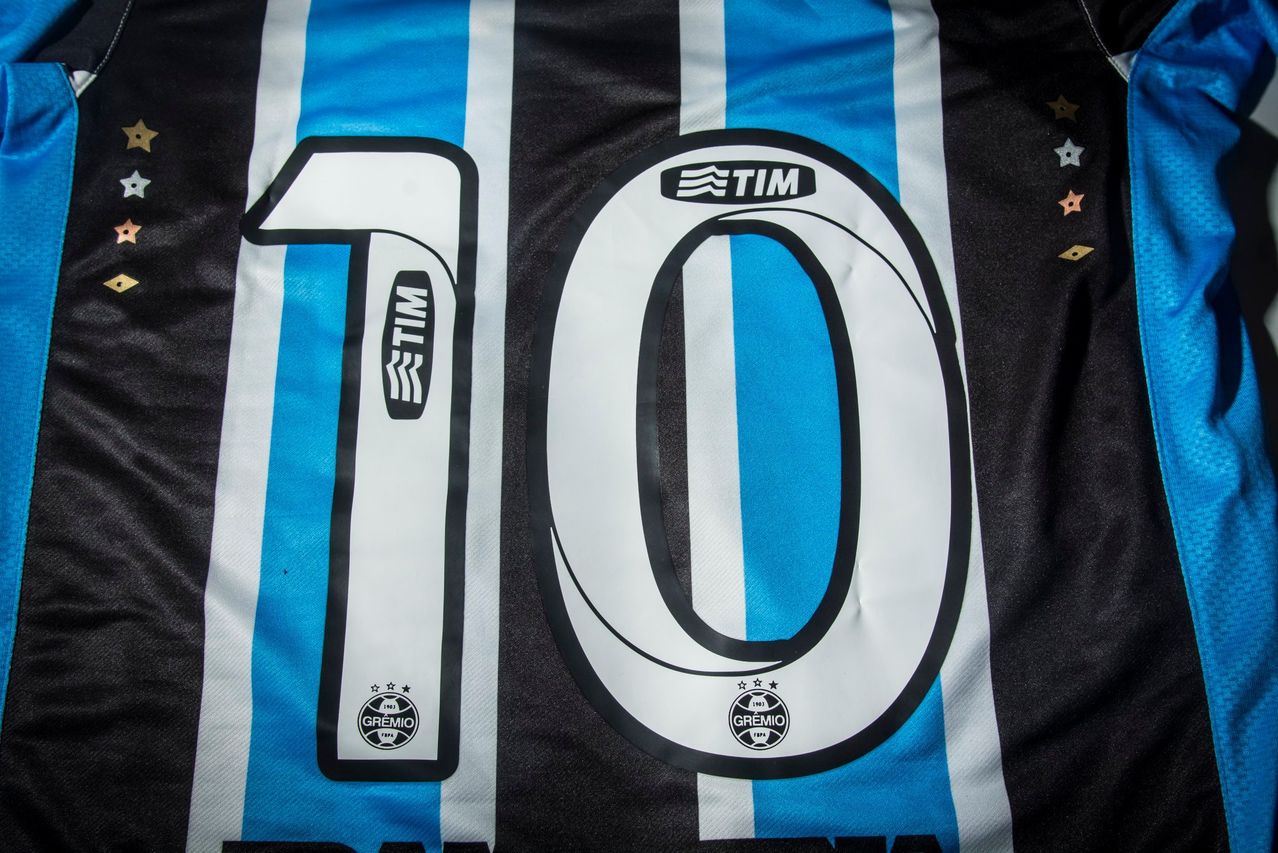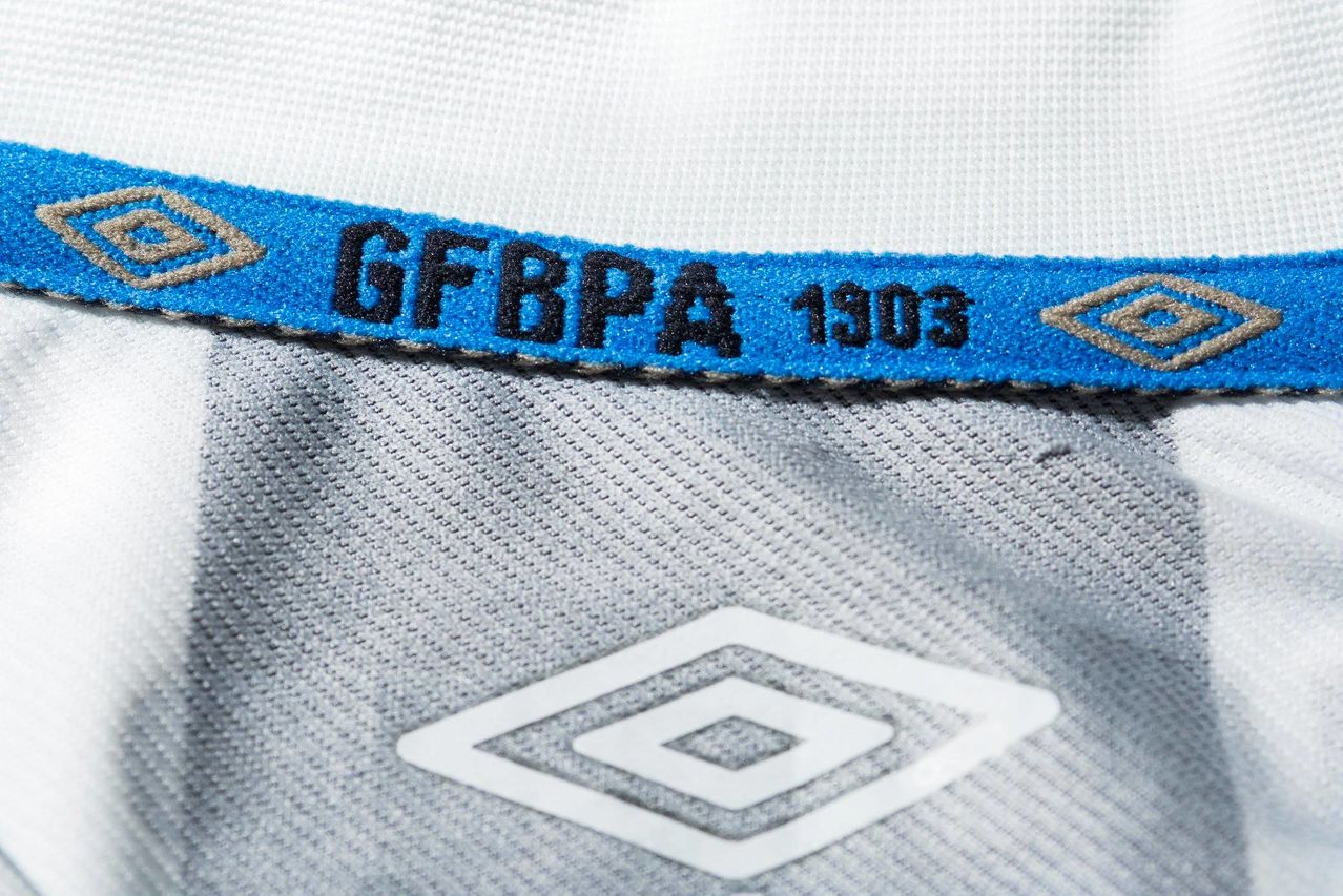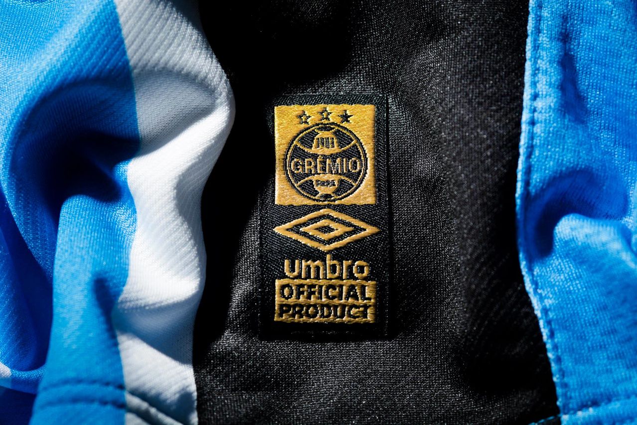 The famous "Tricolor" is intact, in the form of alternating blue and black stripes separated by white, with neat white trim on the stylised V-neck collar and cuffs. The Banrisul sponsor's logo appears in black-bordered white on the back and front - along with other sponsorship logos - and the Umbro logo is in gold.