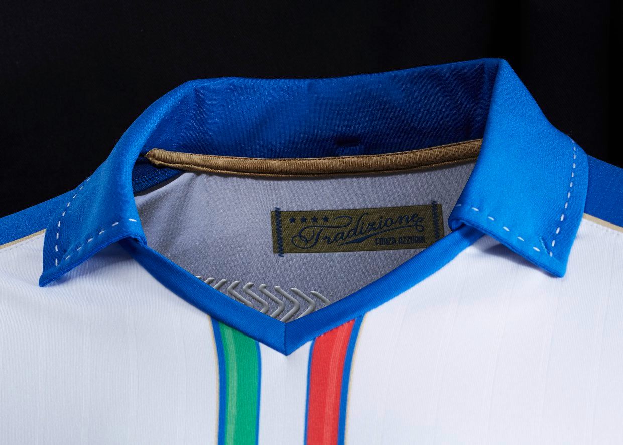 The Azzurri’s new away kit has been inspired by the tradition, passion and pride of Italian football. A white top with a three-coloured stripe representing Italy’s flag, the FIGC emblem in 3D and a blue collar.