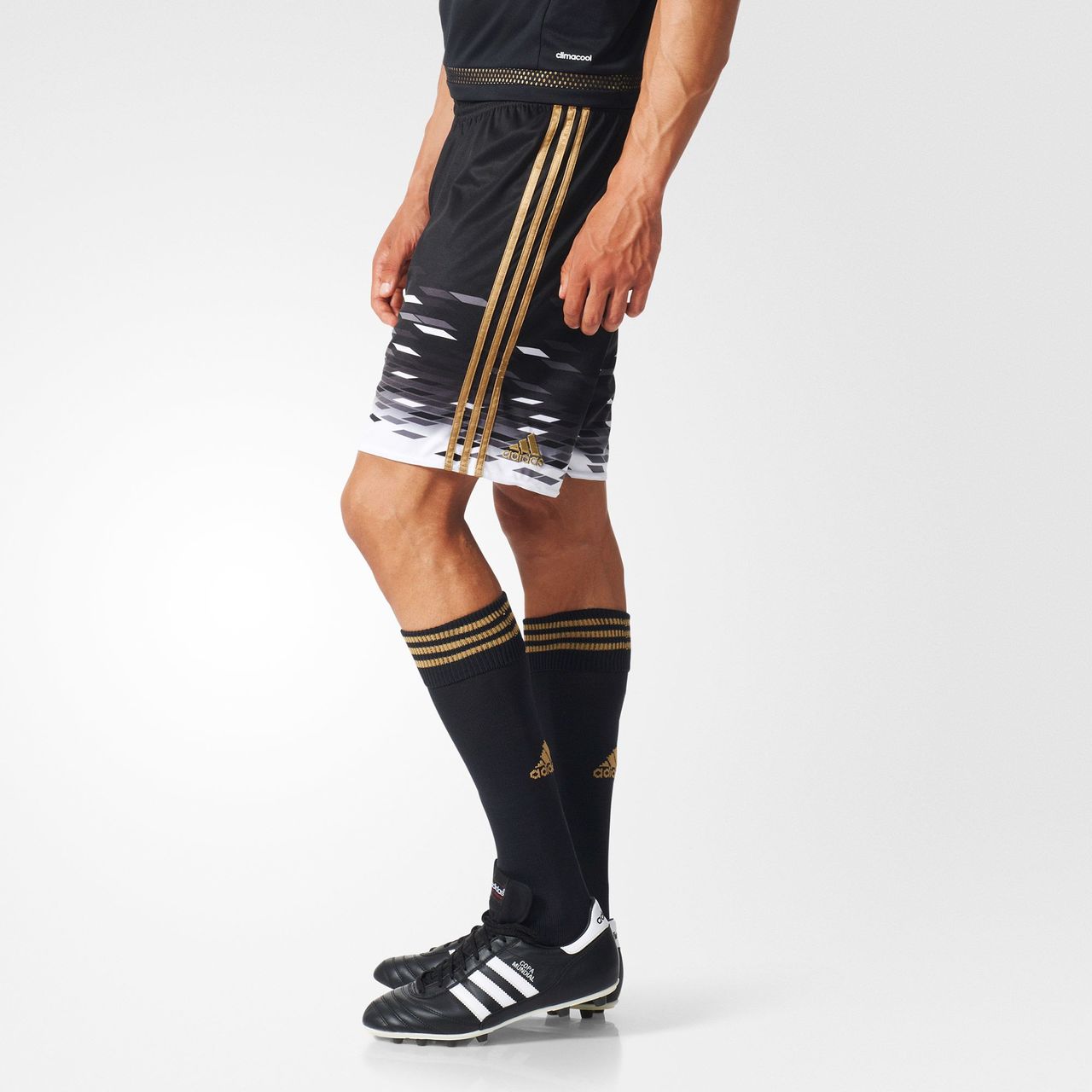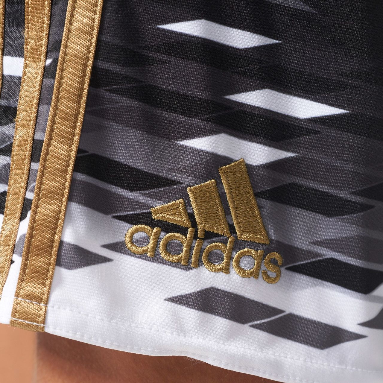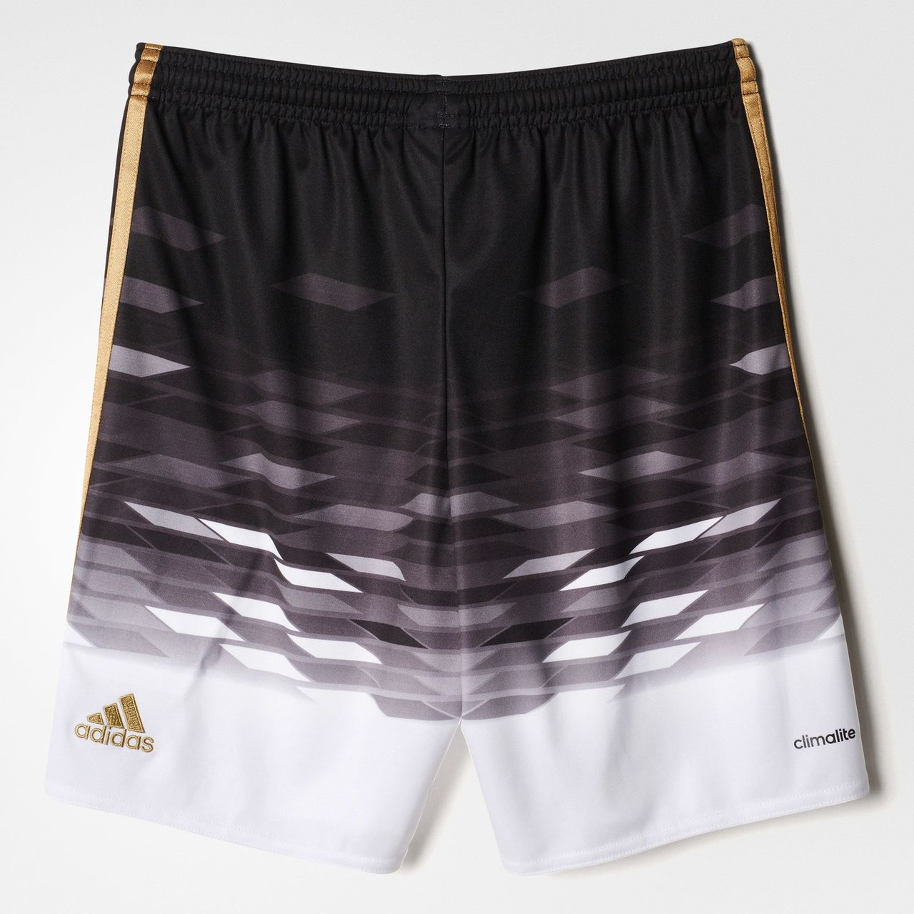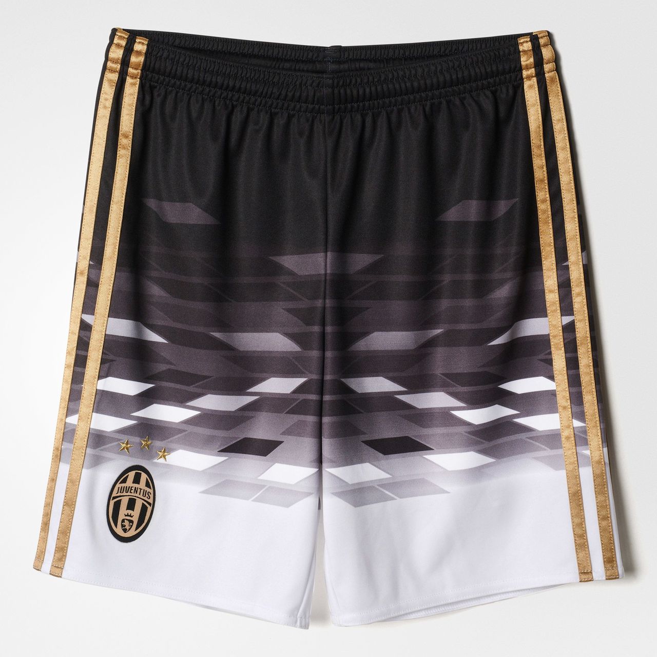 As with the home and away strips, the third kit mirrors the unique exterior of Juventus Stadium. However, this time, the design of the Bianconeri's home ground does not appear on the jersey's hem but on the shorts, featuring a pattern fading from black to white. The three stripes are gold as well as the Juventus crest on the front and the adidas logo on the back.