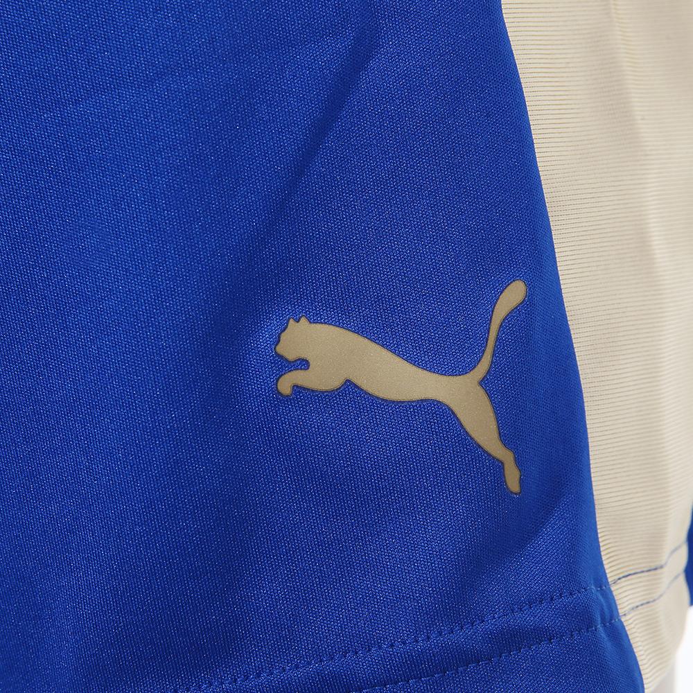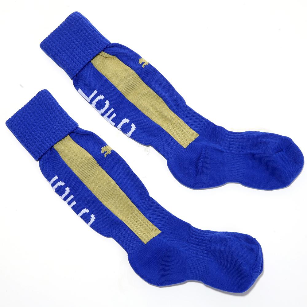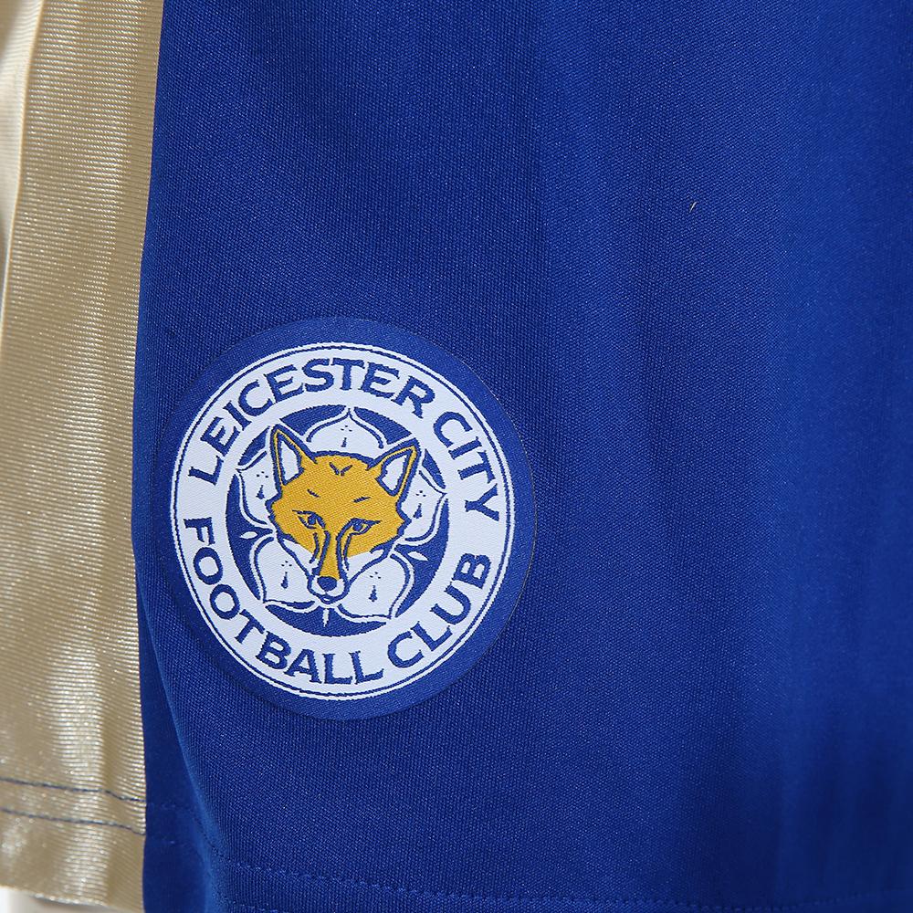 The new shirt features a stripe effect within the familiar Leicester City blue and a gold trimmed V-neck collar. The blue shorts and socks are both complemented by gold trim.