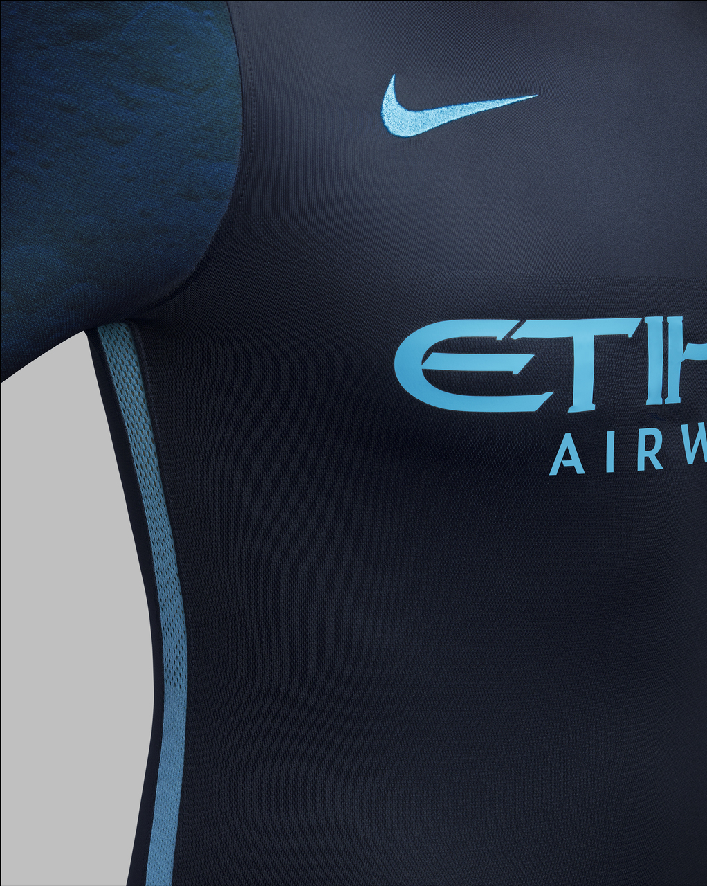 The moon graphic, which appears in tonal blue hues, combines with the shirt’s navy blue body, subtly contrasting sleeves and shoulders, and electric blue detailing — a modern take on Manchester City’s iconic sky blue.