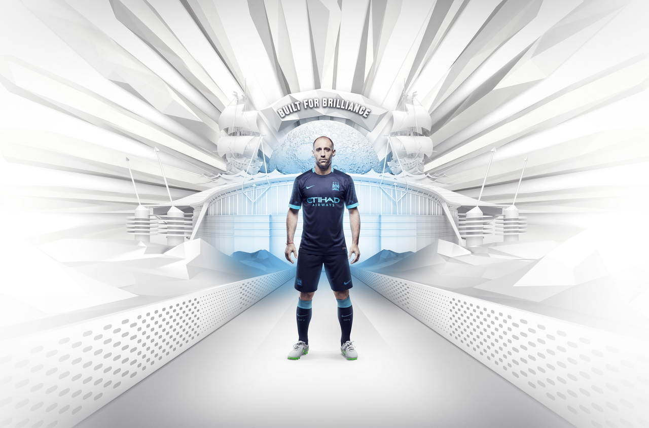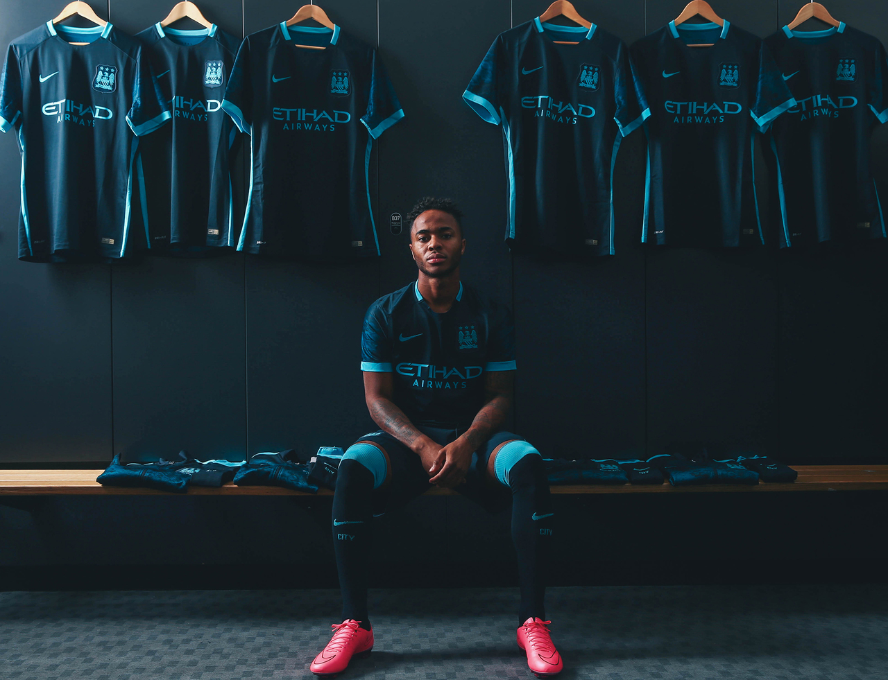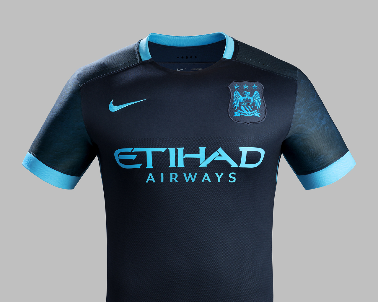 This is the new Manchester City 15/16 Away football shirt by Nike, with a lunar print on both sleeves.
