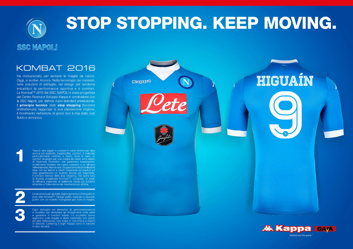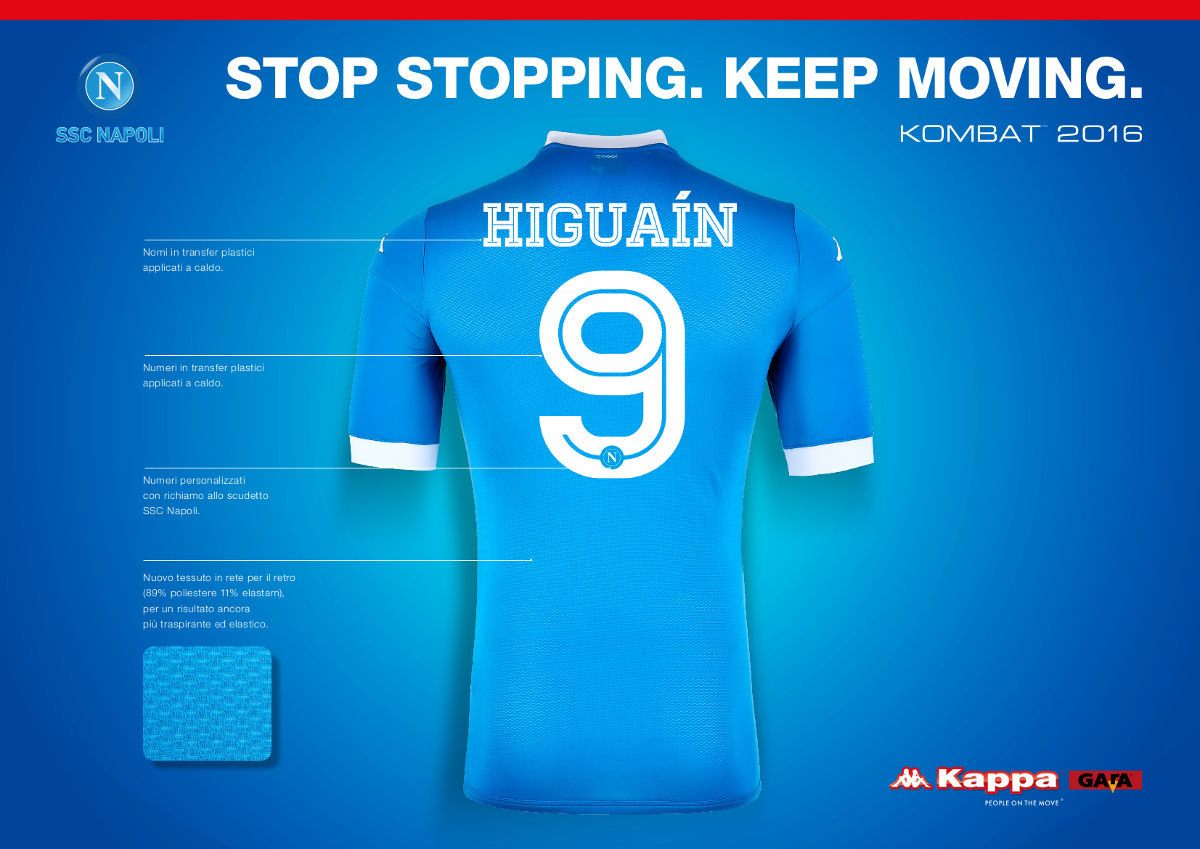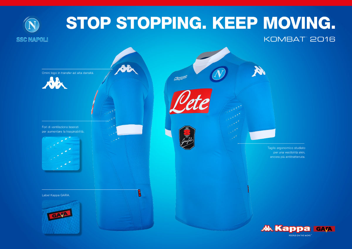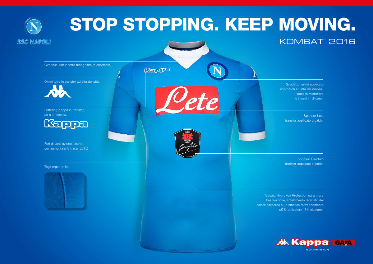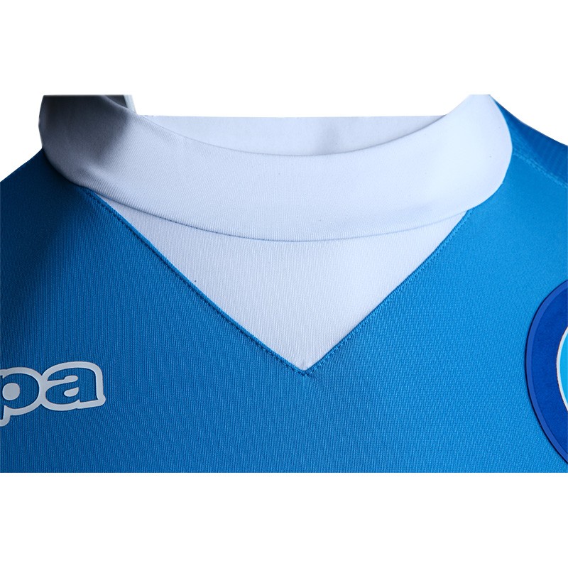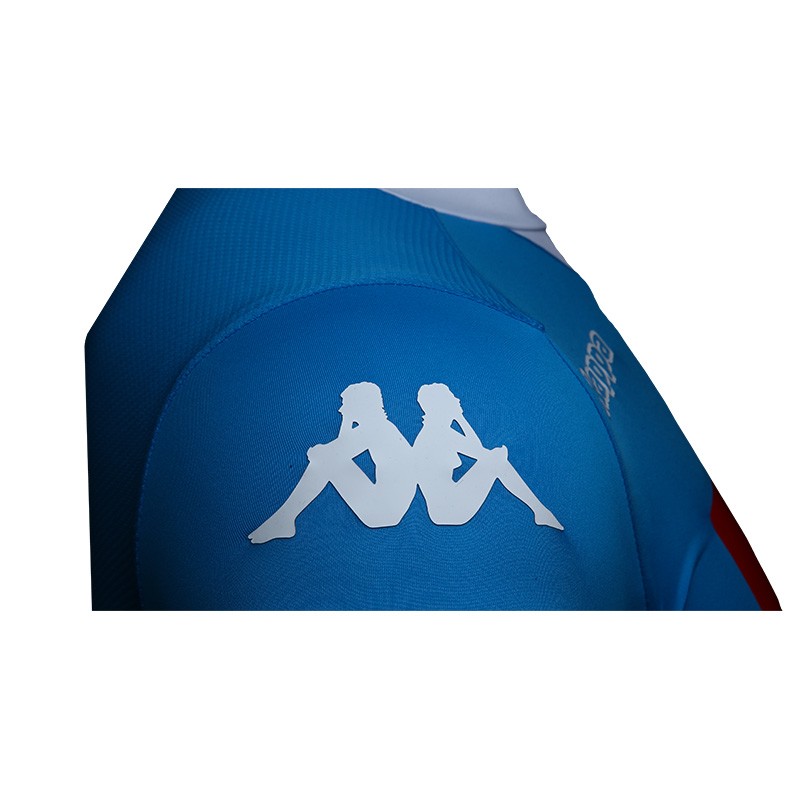 The collar features a distinctive combination of V-neck and crew neck. The SSC Napoli badge is a high definition patch, the Kappa, Lete and Garofalo logos are high quality transfers. The front of the shirt is 87% polyester and 13% spandex. The back is 89% polyester and 11% spandex to provide more breathability and stretch. The Kappa Gara label guarantees the authenticity of the garment.