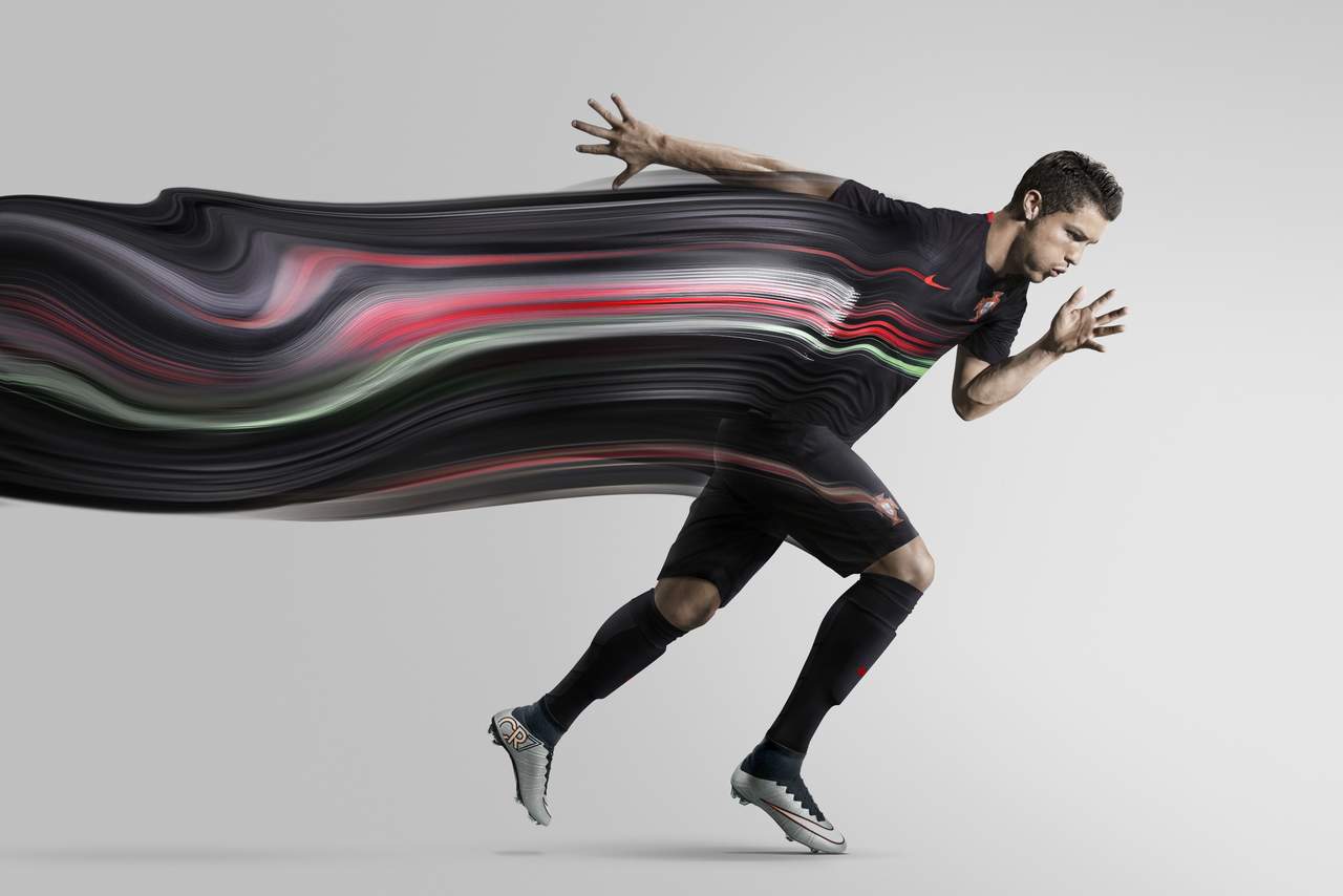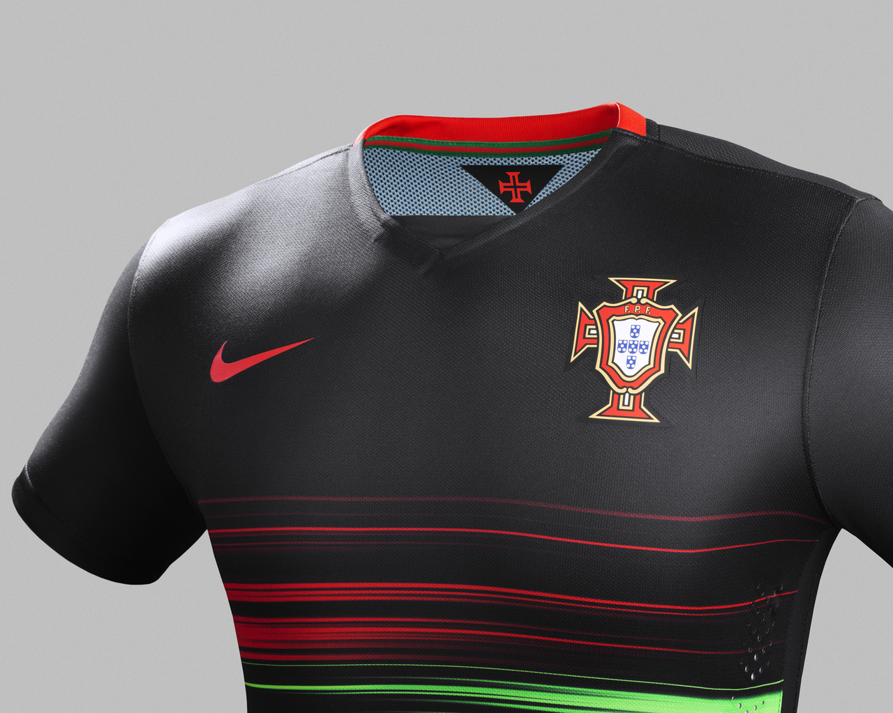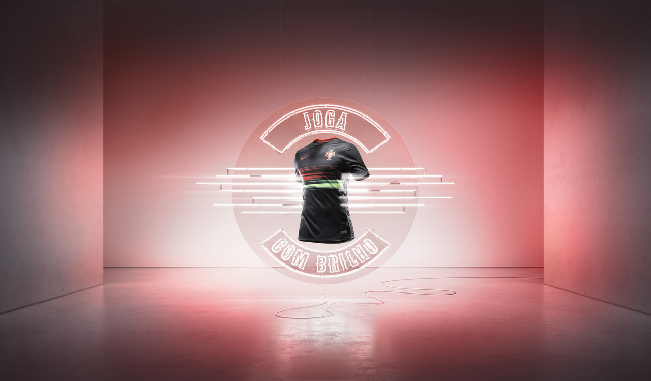 The green and red flashes draw inspiration from the Portuguese national flag and give the effect of having been painted on the black canvas of the away shirt. The two colors move in different directions, the red from the right and the green from the left.
