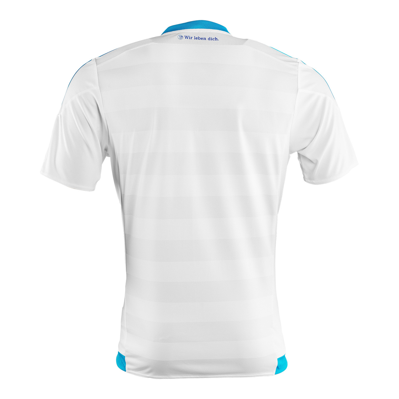 The Bundesliga side will turn out in white - as a primary change - when circumstances dictate next season. Trimmed with a pale, aqua blue - in the adidas stripes, adidas logo and neat overlapping V-neck collar - the shirt's Gazprom sponsor's logo appears in royal blue and a darker hue helps render the club crest to complete this trinity.