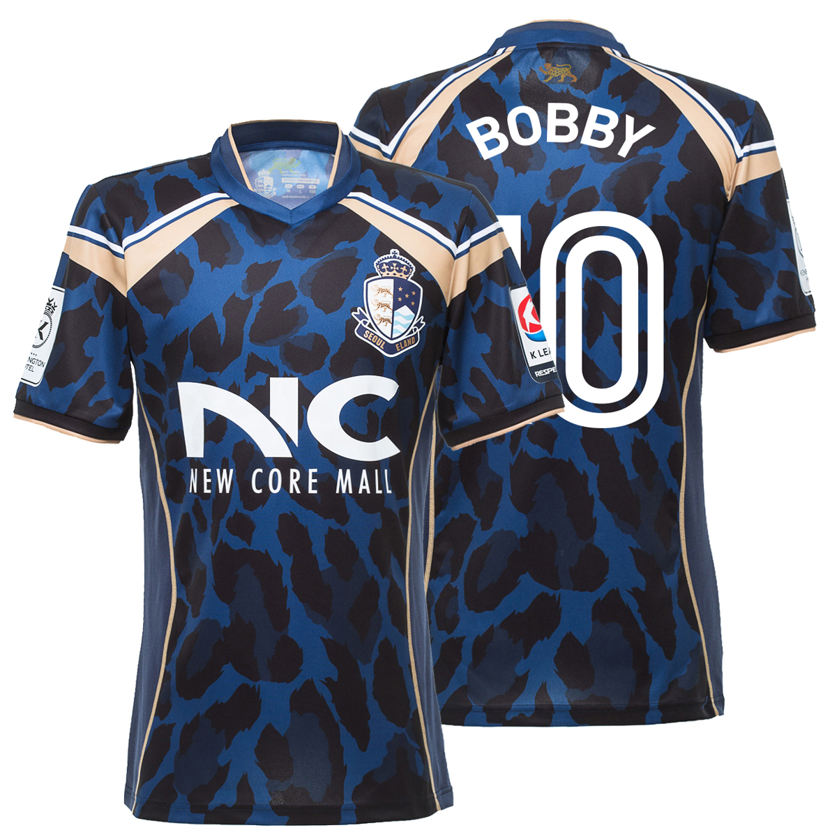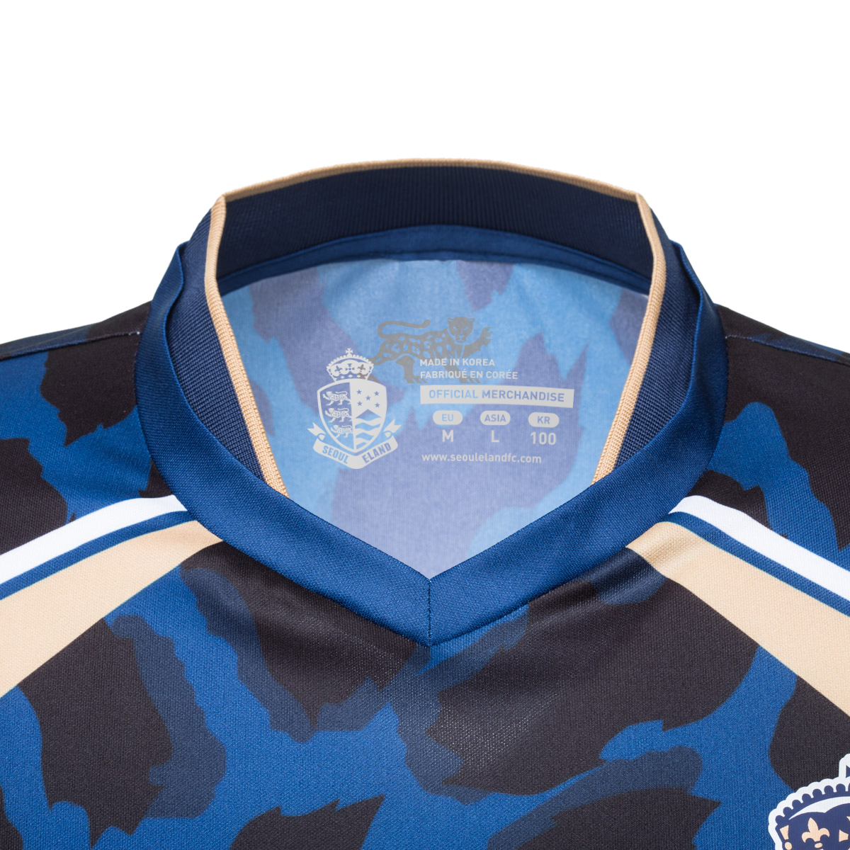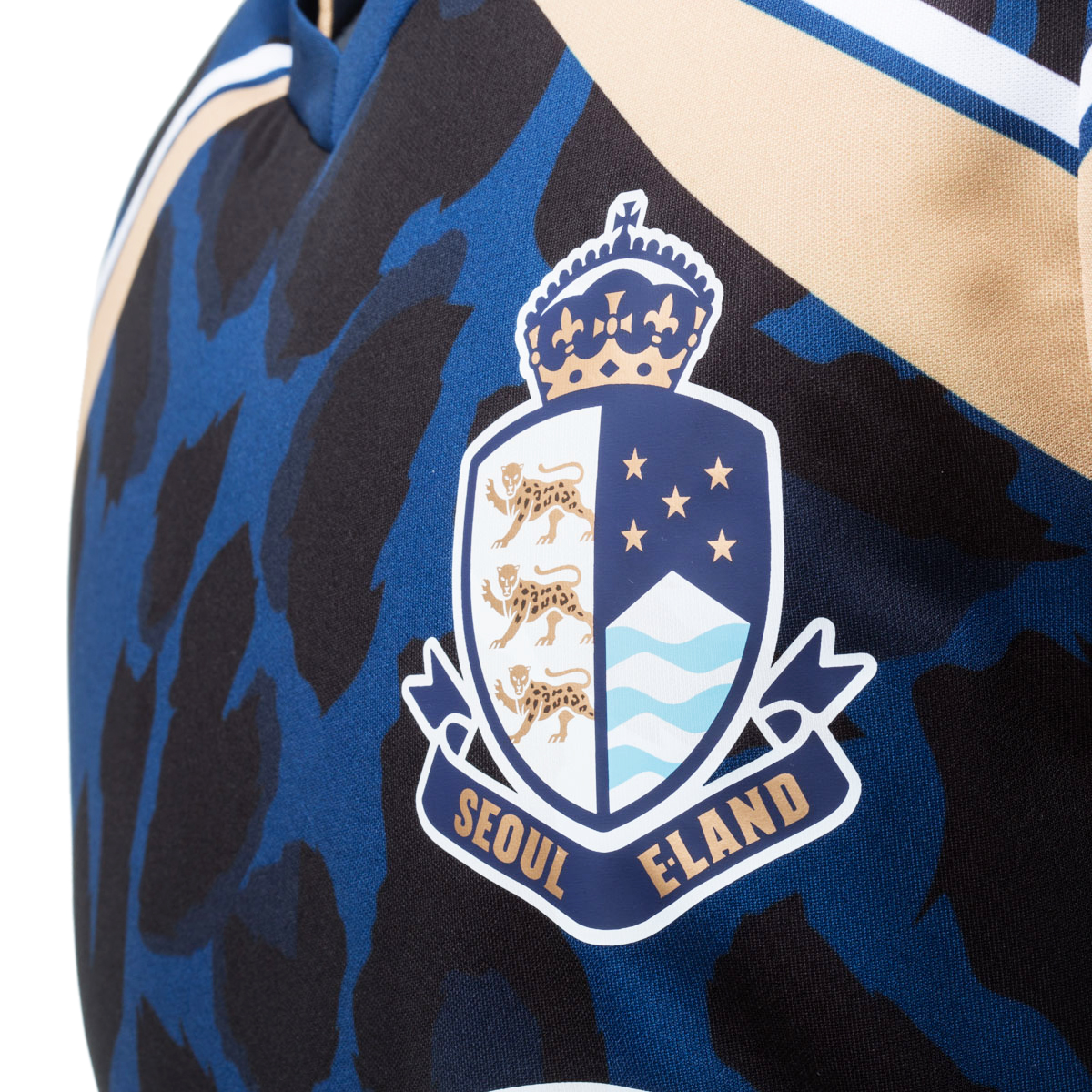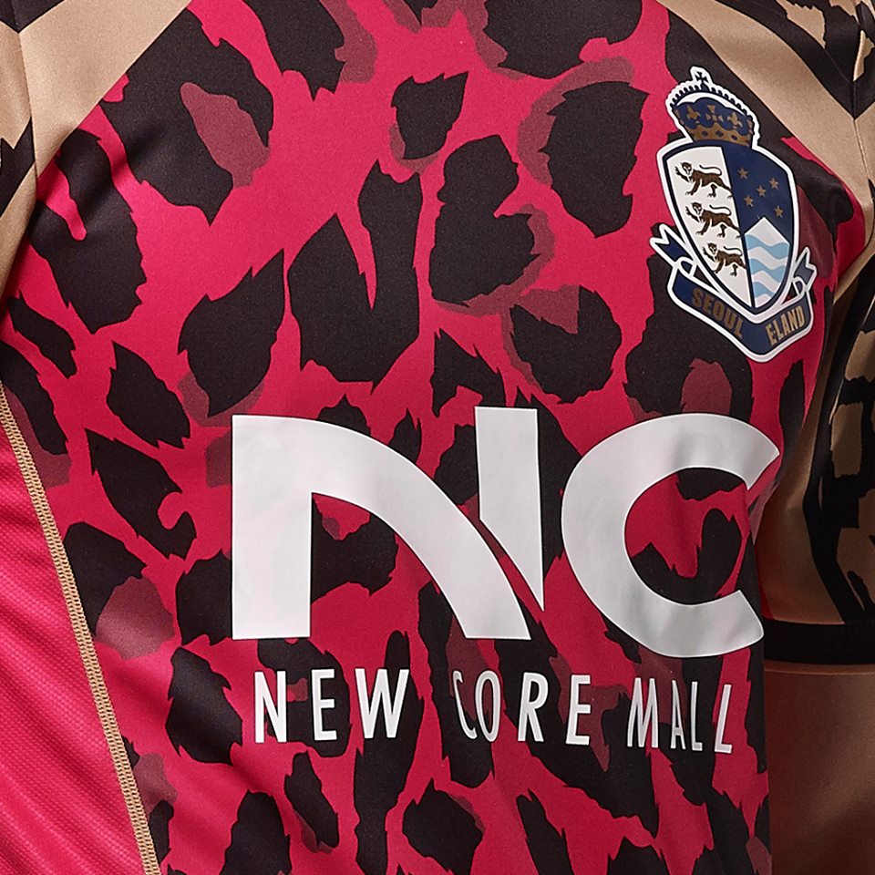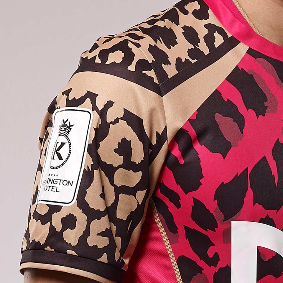 As a recently formed side, the team from the capital will be catching the eye in a blue, black and gold animal print shirt, complemented with white name and number print and sponsorship logos and a full colour heat-transfer crest. Despite openly celebrating a partnership with Liverpool FC supplier New Balance Football, the E-Land kit appears to be self-manufactured/unbranded.