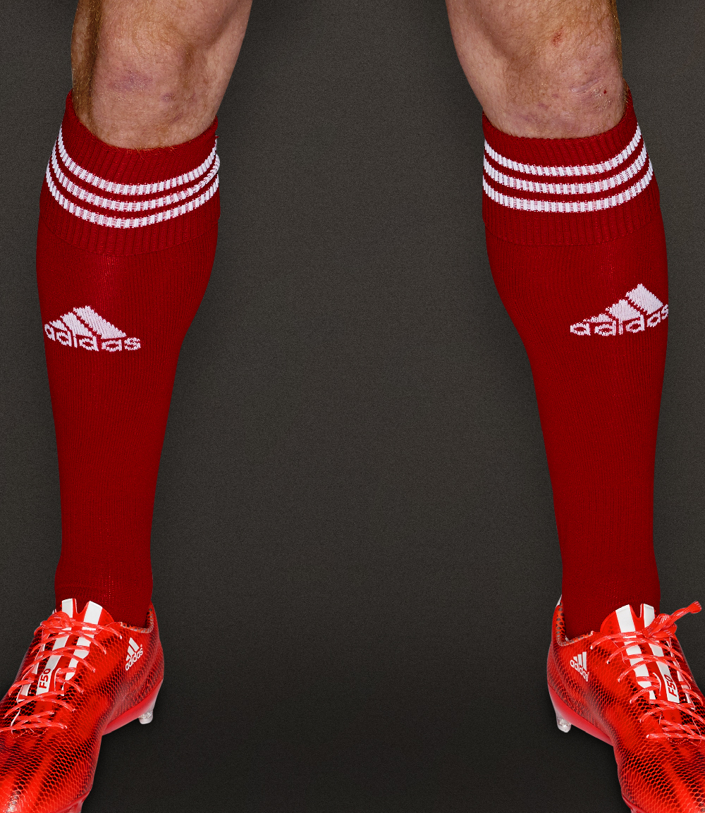 Primarily white, the retro style celebratory shirt features red pinstripes, a collar with press studs and the familiar three stripes of our official technical kit supplier. The shirt will also be worn with red shorts and red socks.