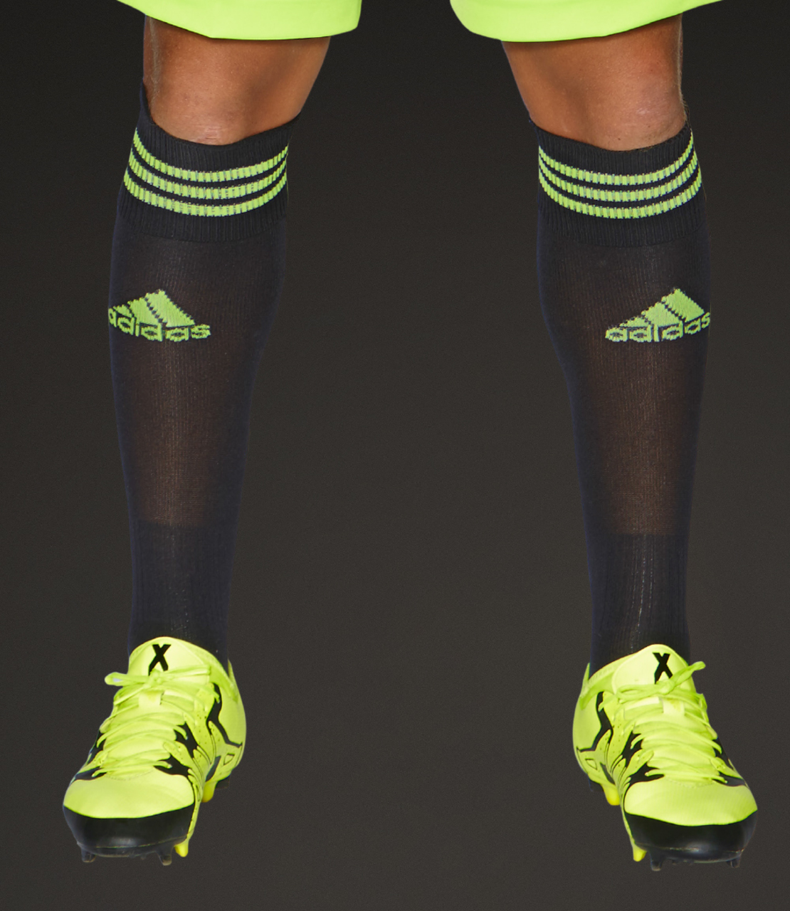 The Adidas designed strip features a V-neck Macaw green shirt with black trim, black shorts and black socks both with a matching Macaw trim.