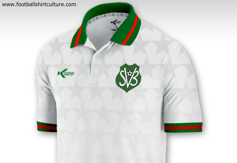 The white shirt echoes the template of the Away shirt (link), with a repeated star effect in the watermark, the full colour green crest and the Klupp logo appears in green to match.