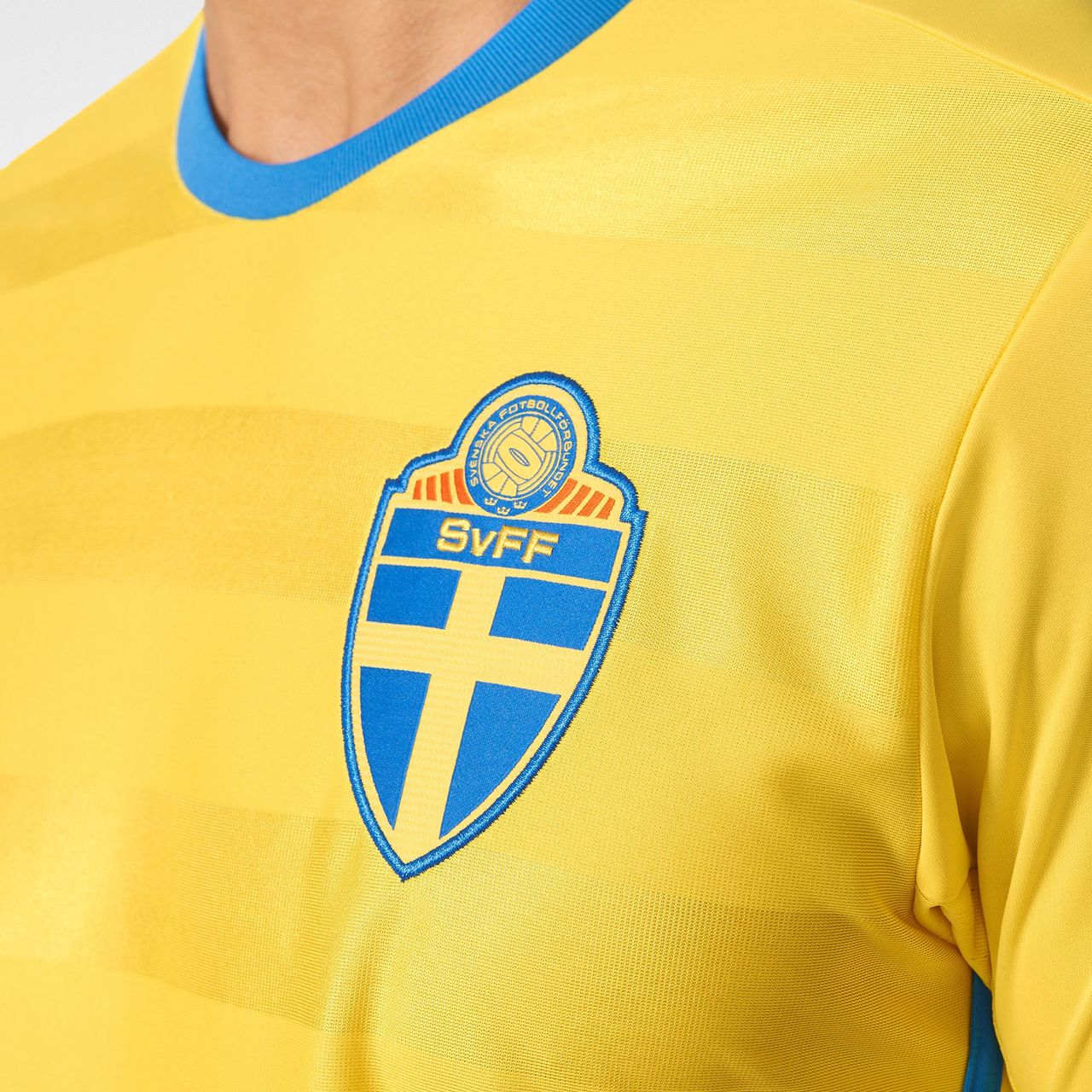Adidas Three Stripe sides with updated round collar and sleeve trim design for 2016. Traditional yellow base enhanced by bright blue details and embroidered SvFF crest, Swedish flag motif on sleeve and SVERIGE fabric wording on back neck collar insert.