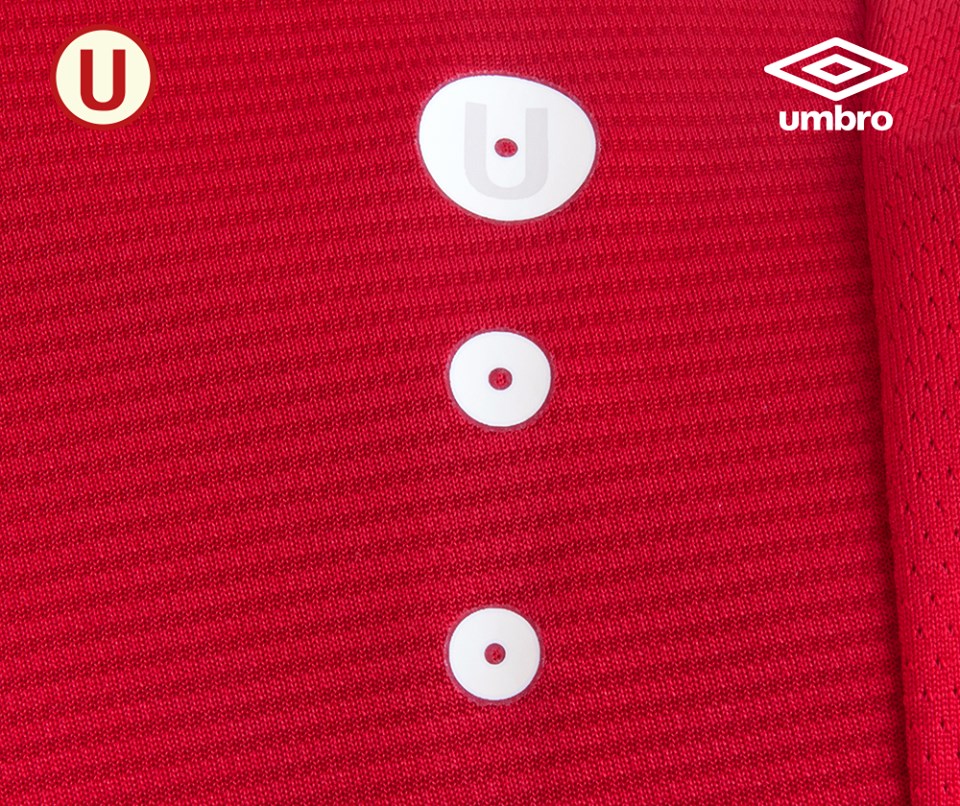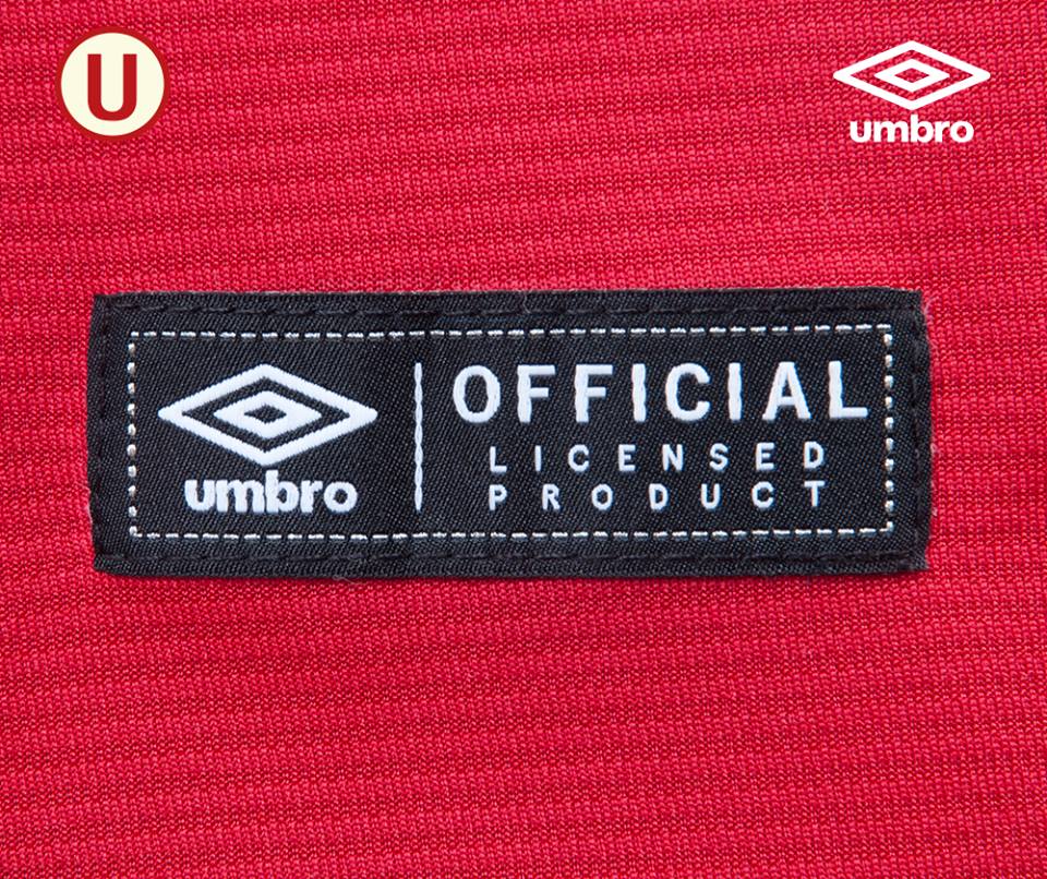 The collar is a neat V-neck in red and white and perfectly matches the sleeve cuffs. There is, running diagonally on the chest, a stylised stitch detail with the white embroidered Umbro logo on one side and the famous club crest on the other.