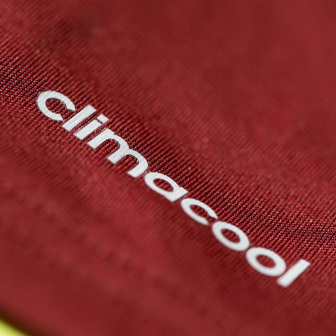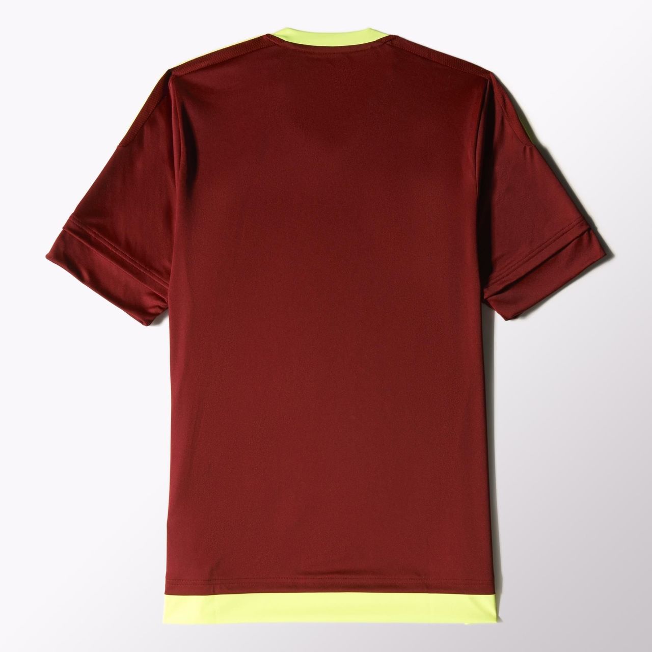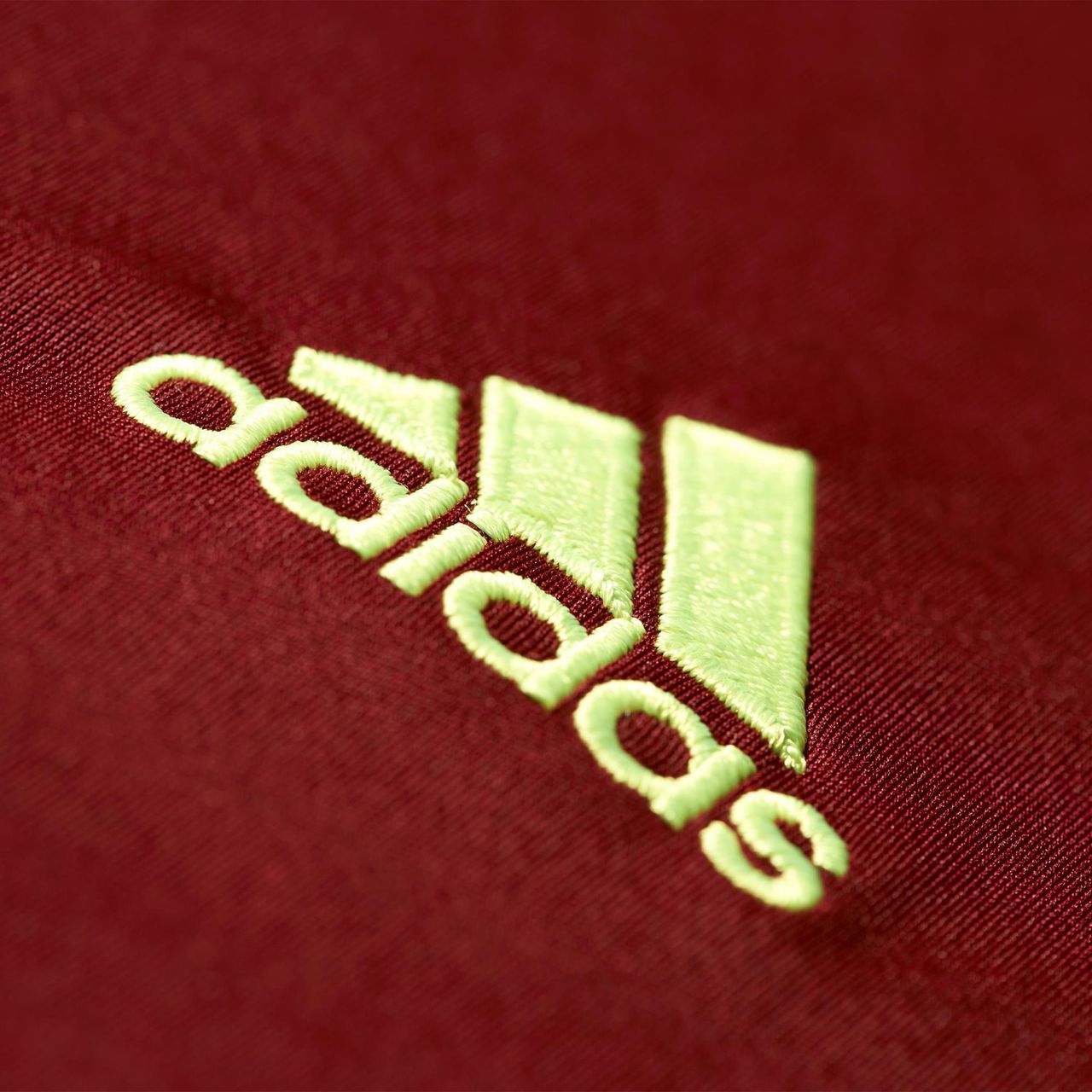 In keeping with the "Vinotinto" nickname, the shirt is in burgundy and carries over the bright yellow fluoro tone of last year's Away version. The crest is stitched on and the V-neck collar is in the aforementioned yellow, on a shirt featuring Climacool technology to keep the players cool and dry.