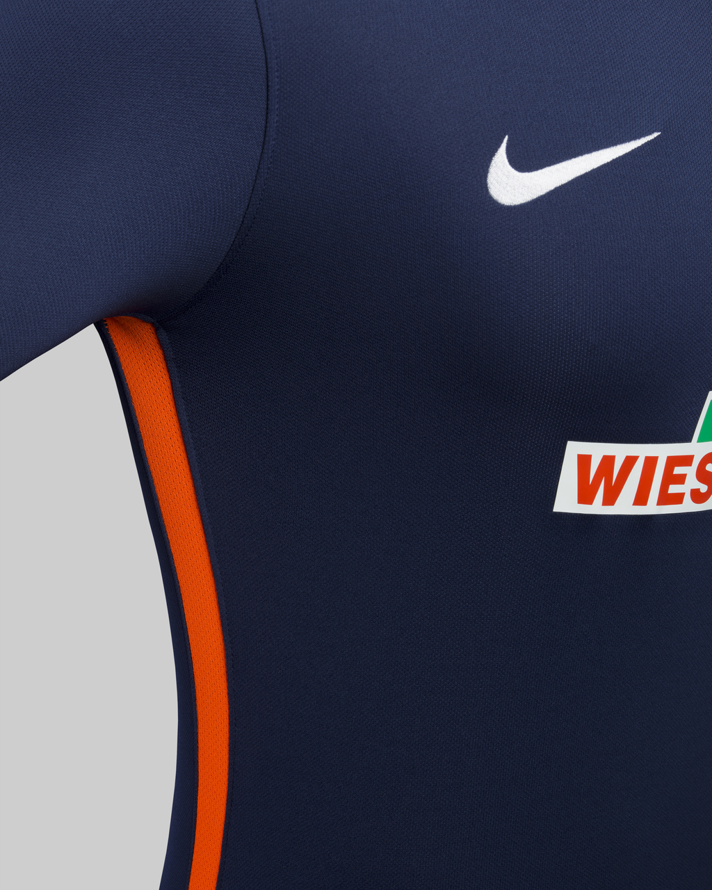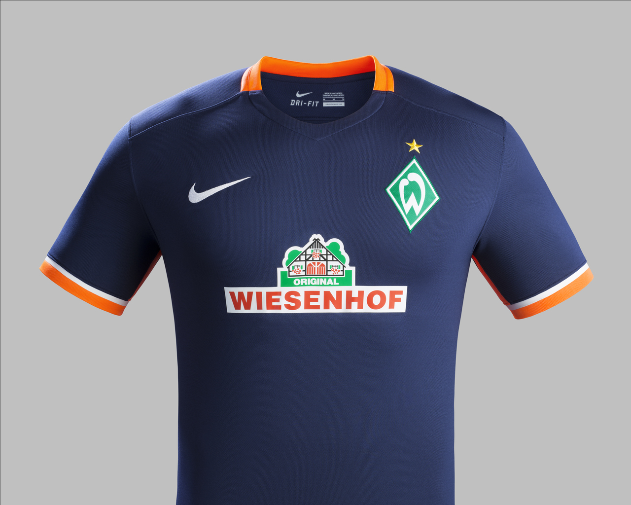 For the first time in its history, SV Werder Bremen will sport an entirely navy blue away kit. The 2015-16 uniform also features orange details that connect the design to that of past home kits, which employed the color as a highlight to the club's traditional green.