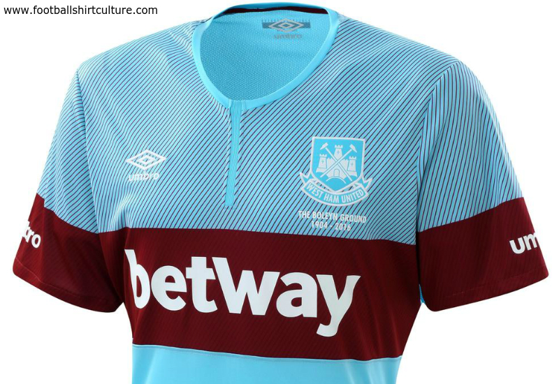 The away kit is completed by sky blue shorts with a claret trim and sky blue socks with a claret hoop. The shirt again pays homage to the momentous final season by including the ‘Boleyn Ground 1904-2016’ sign-off underneath the club crest as well as on the back neck area.