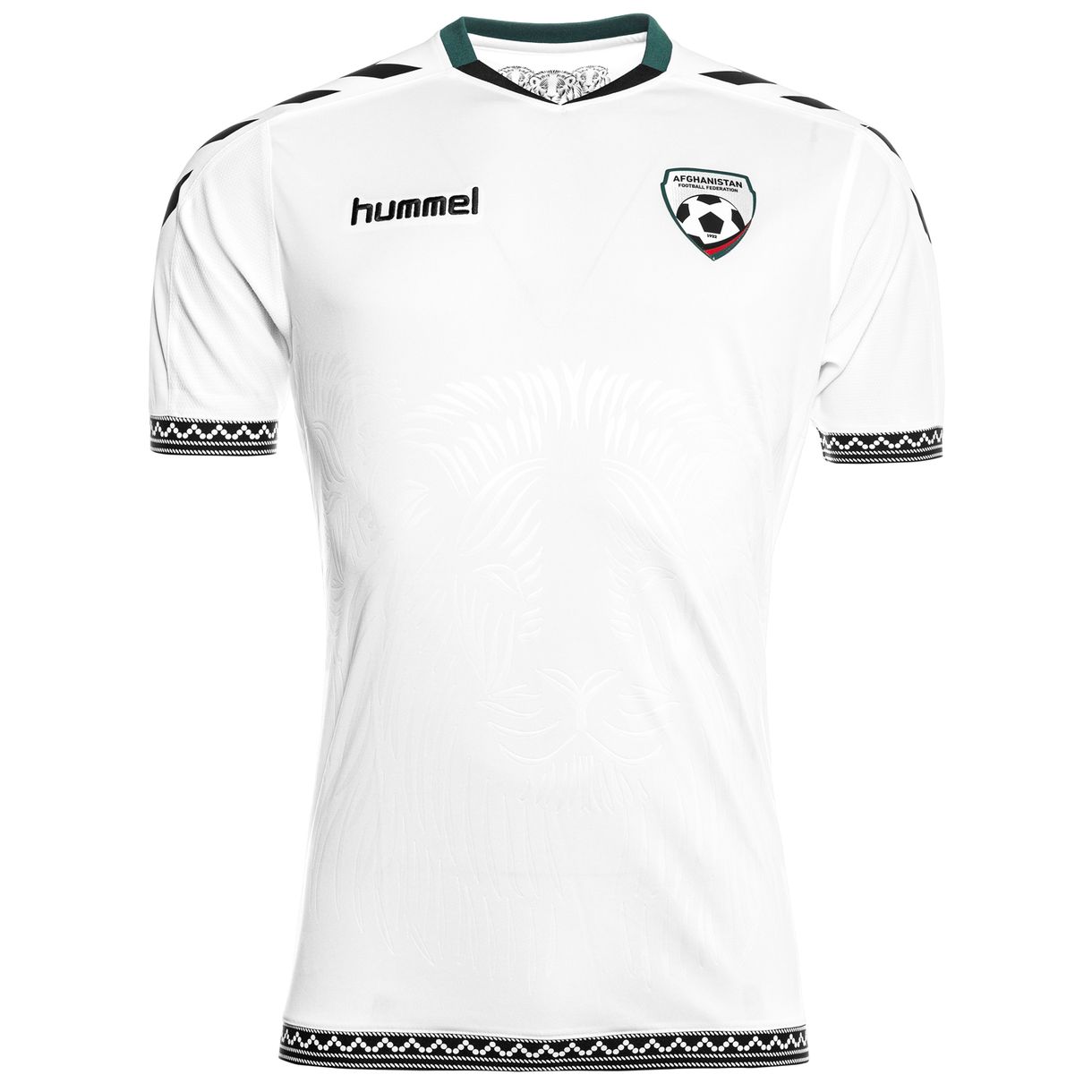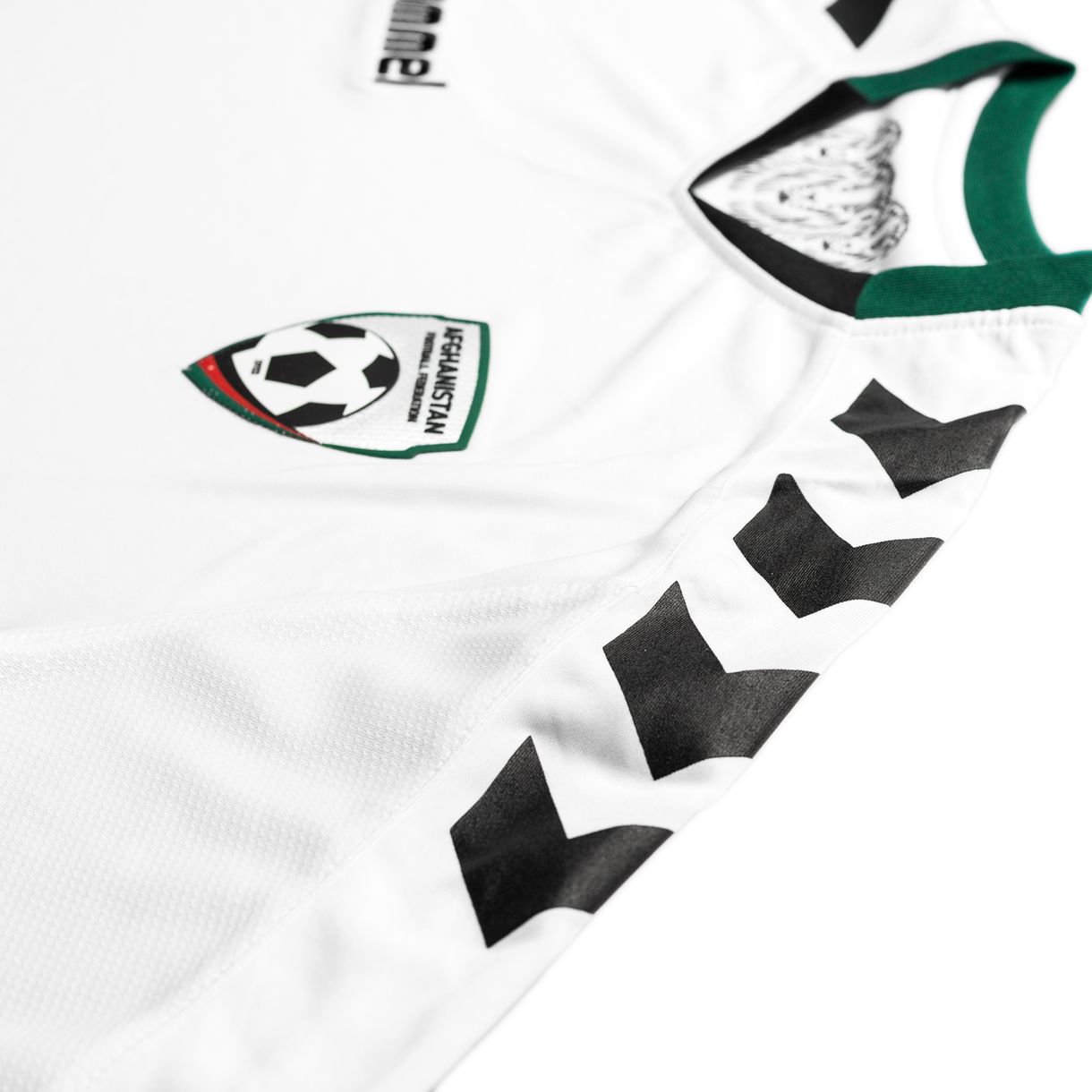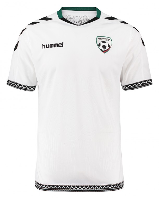 The 2016 Afghanistan away shirt is made from 100% polyester and features mesh panels for breathability. The jersey comes with printed hummel chevrons on the sleeves and the badge of the Afghanistan Football Federation (AFF) in a 3D effect as well as an embroidered hummel logo.