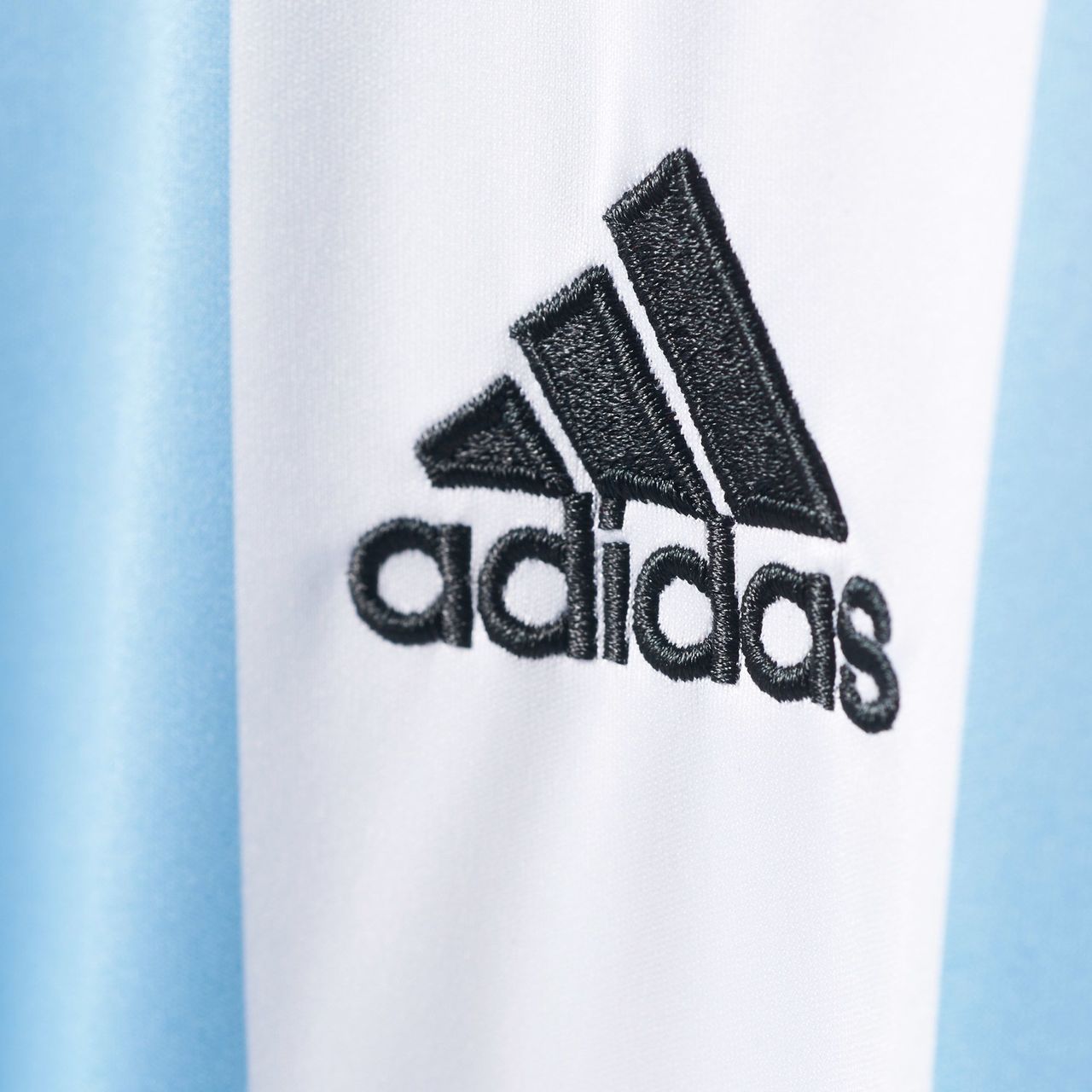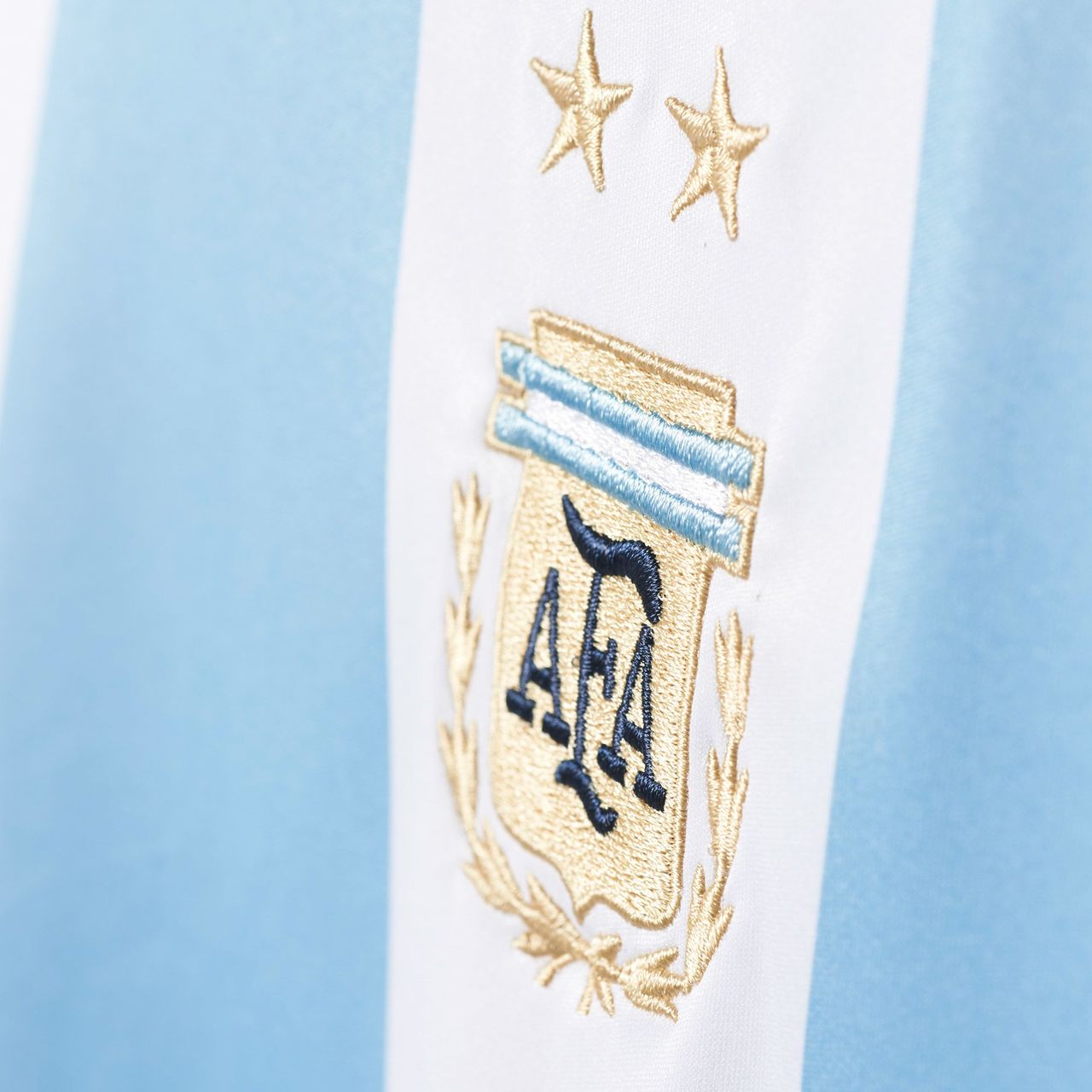 This official Argentina home jersey carries the familiar Asociación del Fútbol Argentino crest (with accompanying FIFA World Cup championship stars) and adidas Performance branding, embellishing a smart and current design with black crew neck collar, sleeve cuff and mesh panel features.