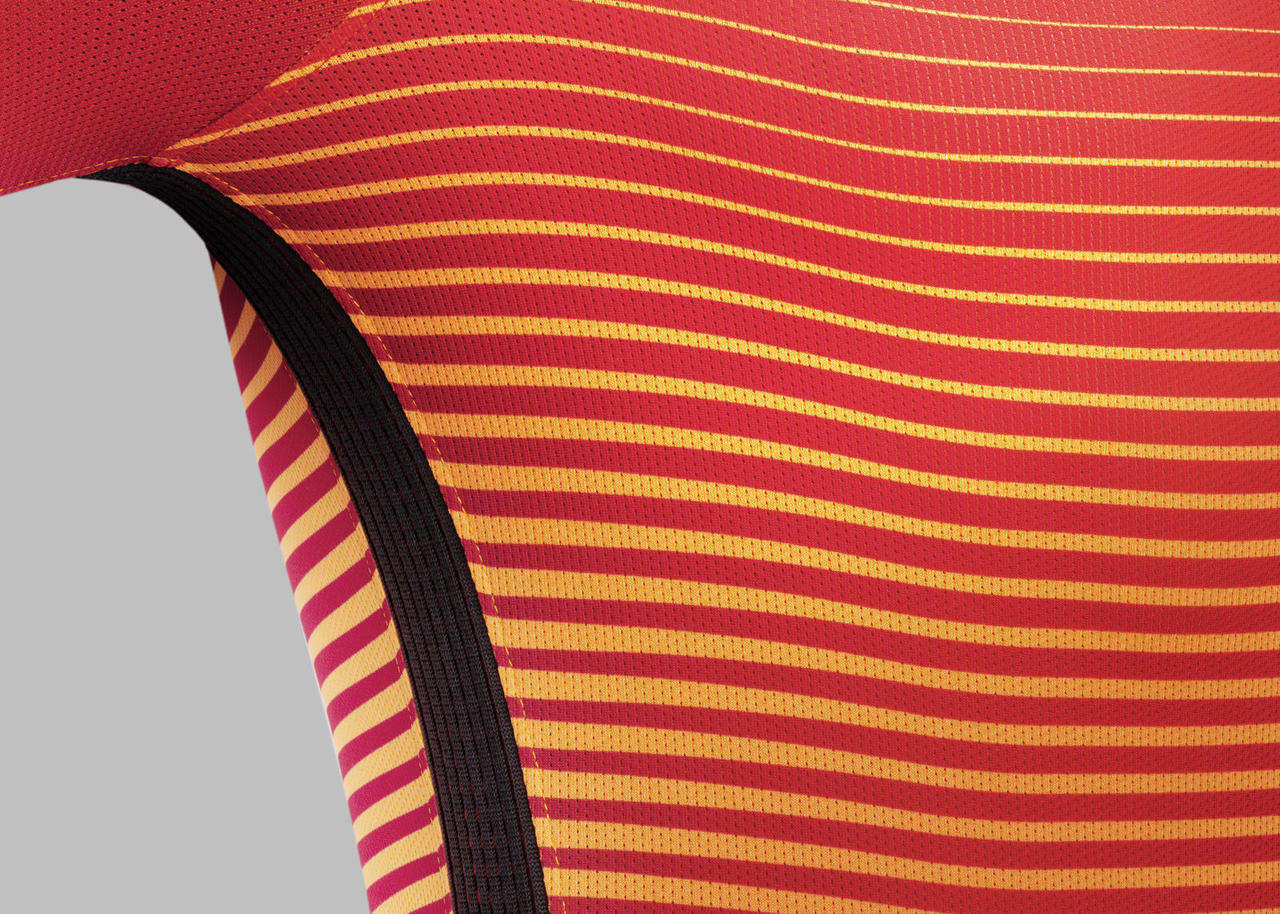 Expanding when the player is in motion, the stripe maximizes ventilation and reveals a subtle flash of darker red. Bright orange socks, with an action red linear graphic on the calf, accentuate speed.