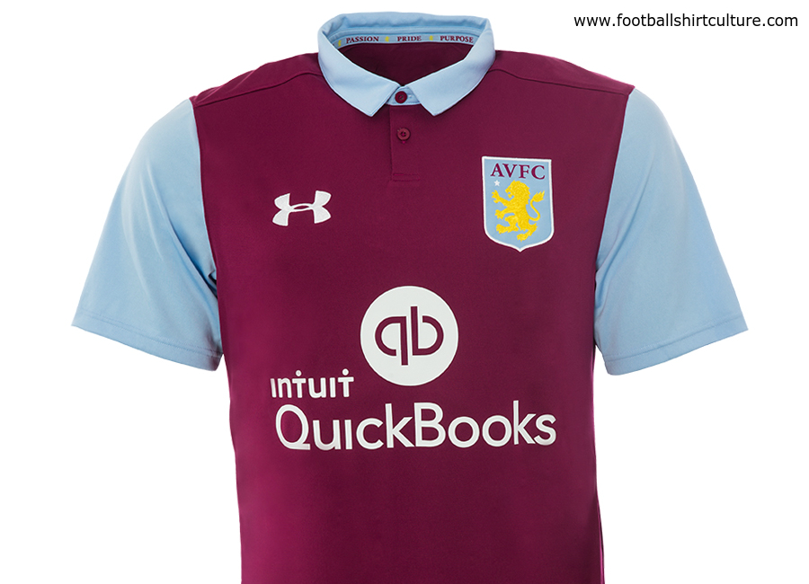Aston Villa's new 16-17 home shirt has a traditional classic claret body, with a contrasting sky blue collar and sleeves. The shirt has a back neck label showcasing the Club’s core values – Passion, Pride, Purpose.