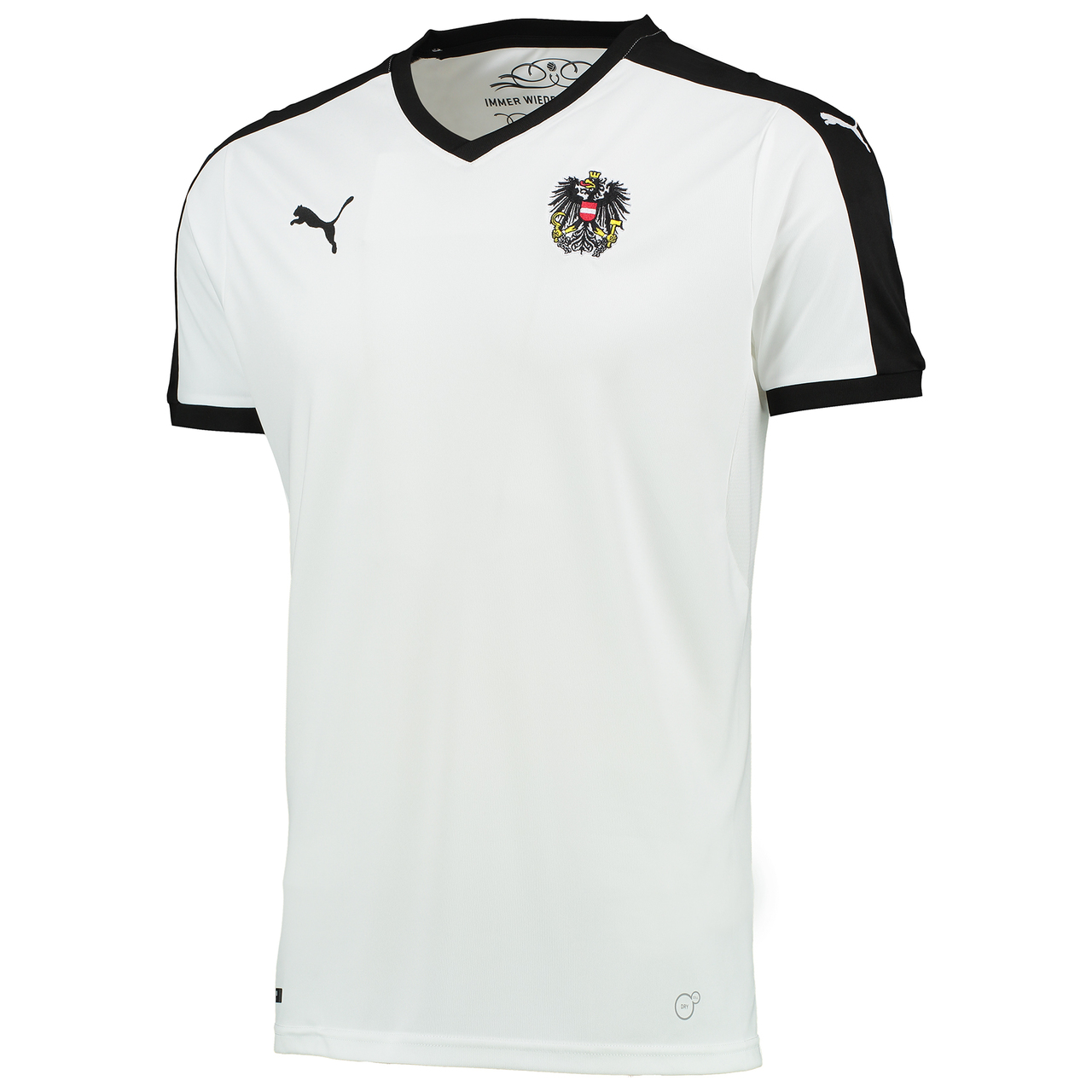 With a contemporary take on a heritage look inspired by PUMA and the ÖFB's longstanding history, the white shirt features black details including a V-neck collar and Form Stripe panels inserted along the sleeves and sleeve cuffs. The ÖFB badge is inserted over the heart and the PUMA Cat is placed on the right side. The kit is completed with black shorts featuring white Form Stripes on either side, and matching black and white socks.