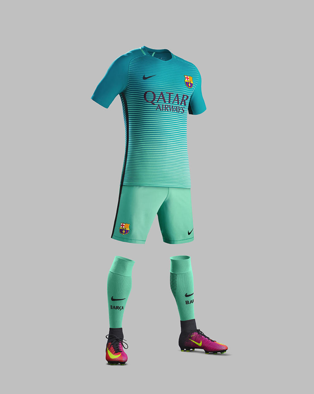 F.C Barcelona's new third kit incorporates a vibrant blend of green tones, with the shirt featuring contrasting horizontal lines against a glow green background, fading towards the hem.