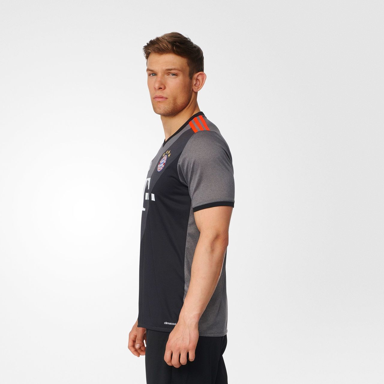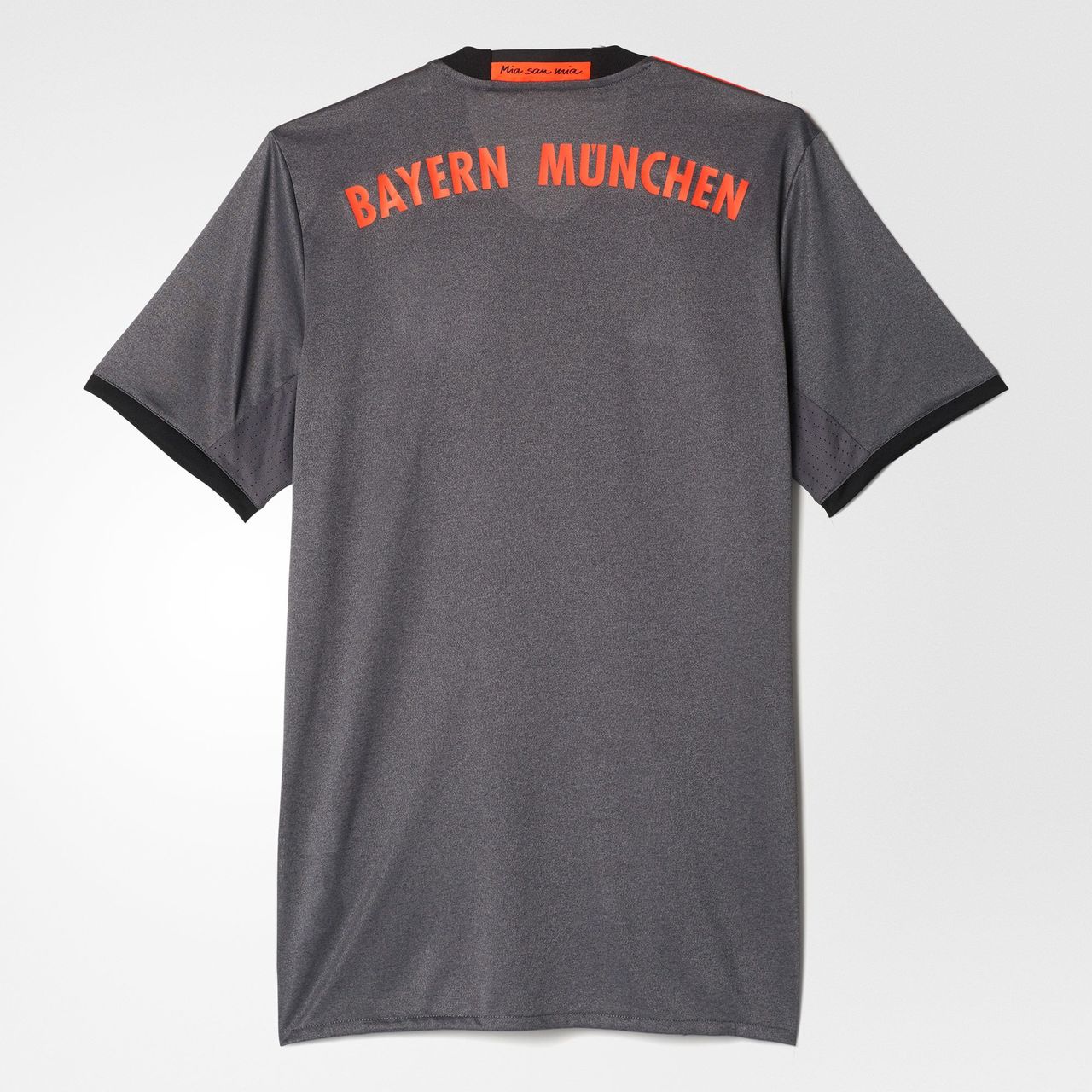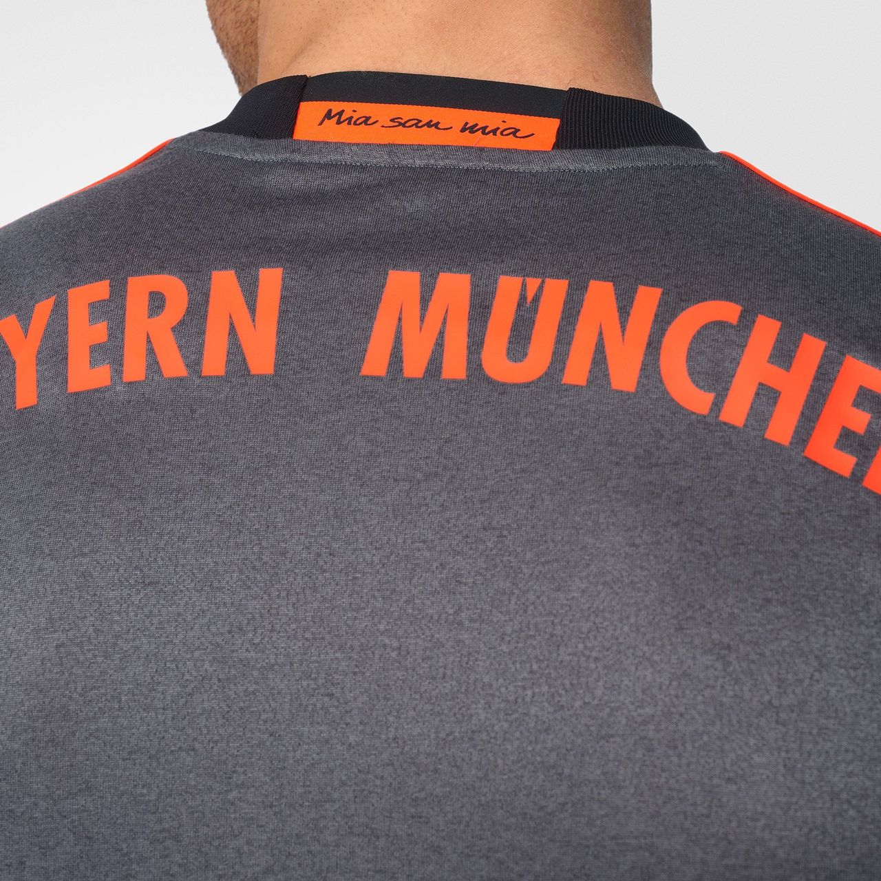 The classic adidas three stripes in orange give it an injection of colour, while the four stars above the crest symbolise the club's league success; as only teams with twenty or more league titles are allowed to feature four stars. The shirt is completed with the Bayern Munich motto "Mia san mia," meaning "We are who we are".