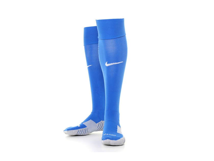 The shorts are blue with a white stripe that continues down the sides. Blue socks with a white Nike swoosh complete the kit.