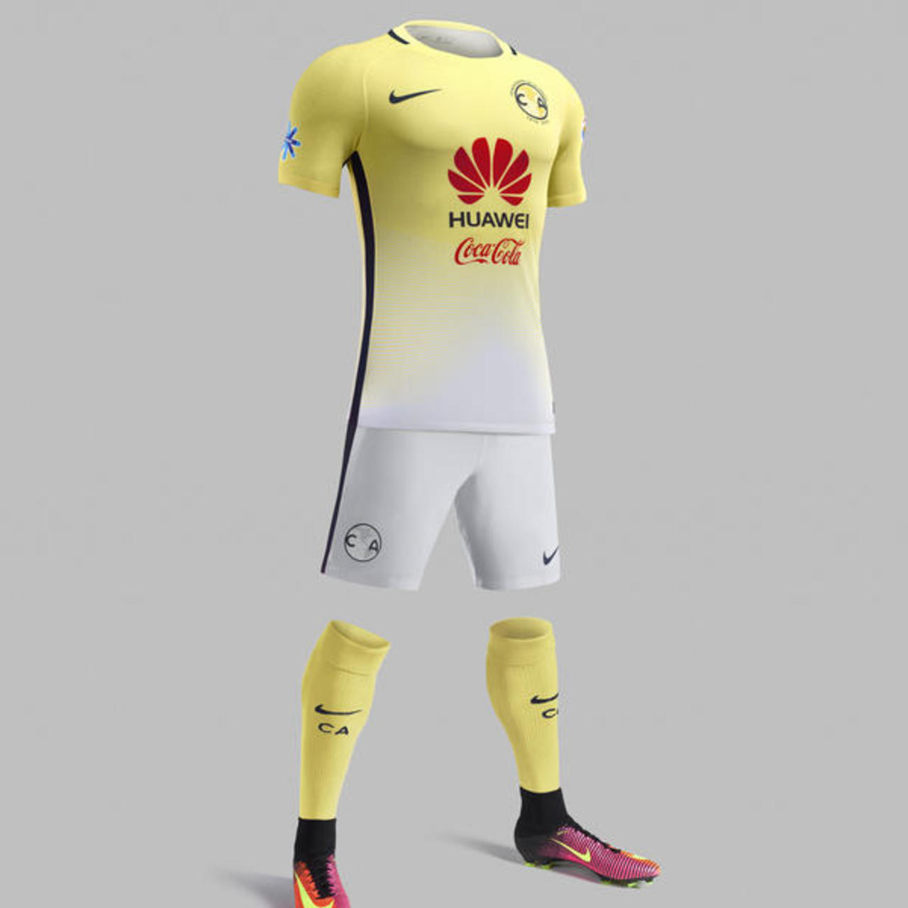 The Club America kit also features striking blue stripes along the sides of the shirt and shorts. Expanding when the player is in motion, the stripe maximizes ventilation. Yellow cream socks accentuate speed.