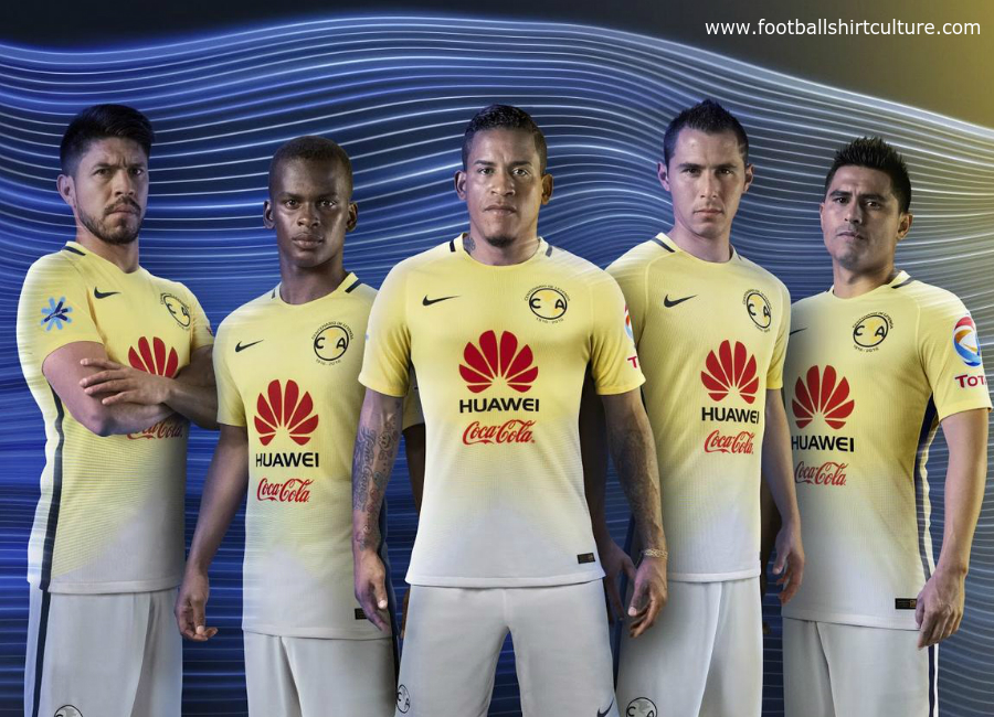 This is the new Club America 2016-17 Home kit by Nike. The new home kit celebrates the Club’s original color, a distinctive yellow cream, and adds a white gradient at the bottom of the jersey that bleeds down into white shorts. The Centenario de Leyenda shield in navy blue sits on the left side of the chest.
