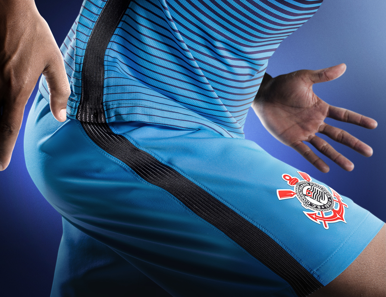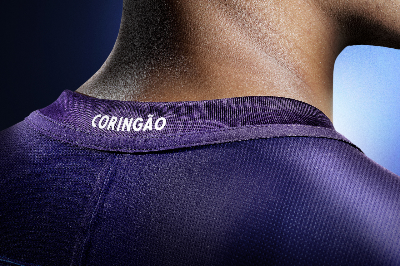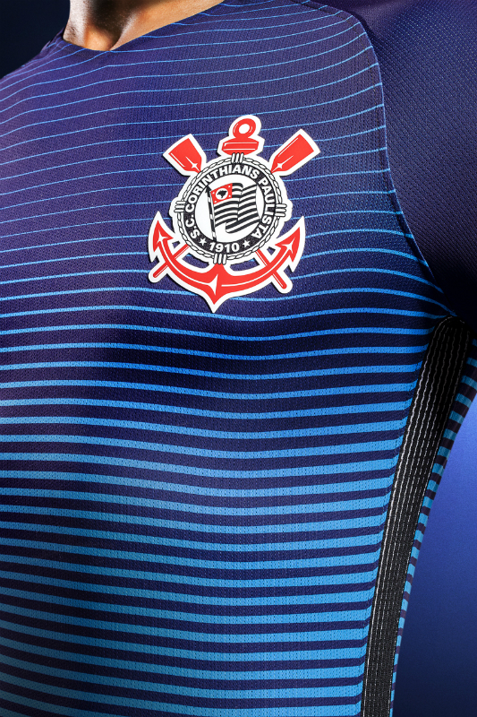 The shirt's modern v-neck collar incorporates the word Coringão, a team nickname, on the back, while the sides of the kit feature a black stripe that runs the length of the shirt and the blue shorts. Expanding when the player is in motion, the stripe maximizes ventilation.