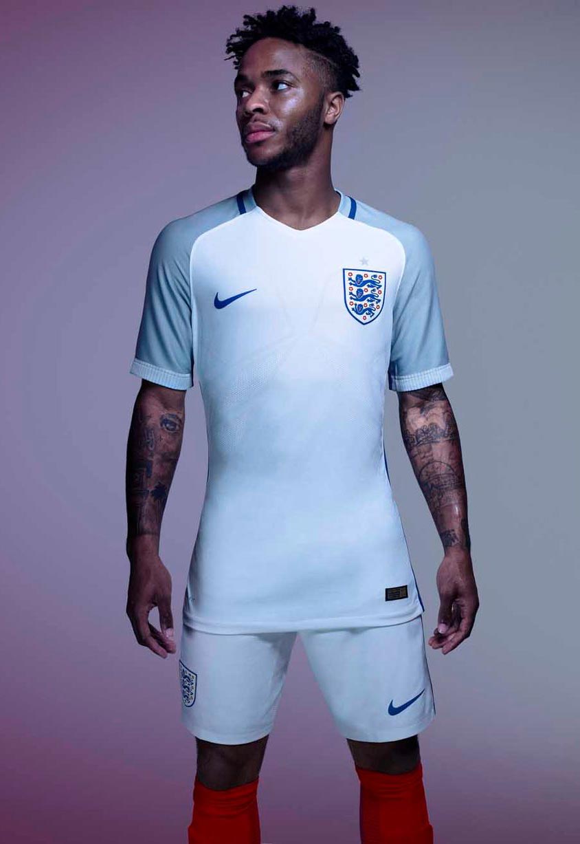 “For both kits we set out with the goal of bringing together the colours that are synonymous with English football: white, red and blue – flashes of contrast are used to illustrate innovative details such as the cross-dyed knitted sleeves and the ventilation-enhancing stripe on the sides of the shirts and shorts.” – Martin Lotti, Nike Creative Director.