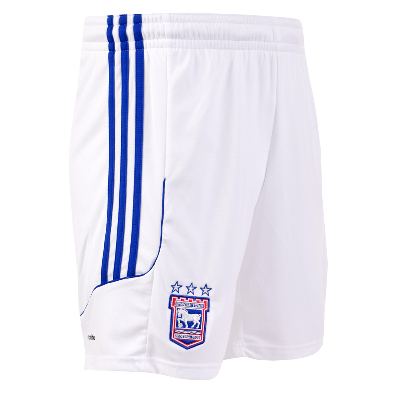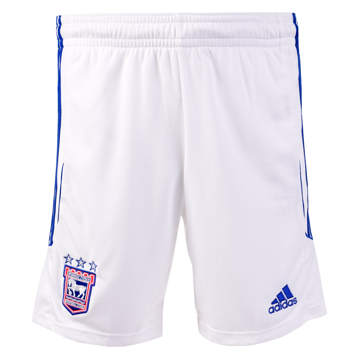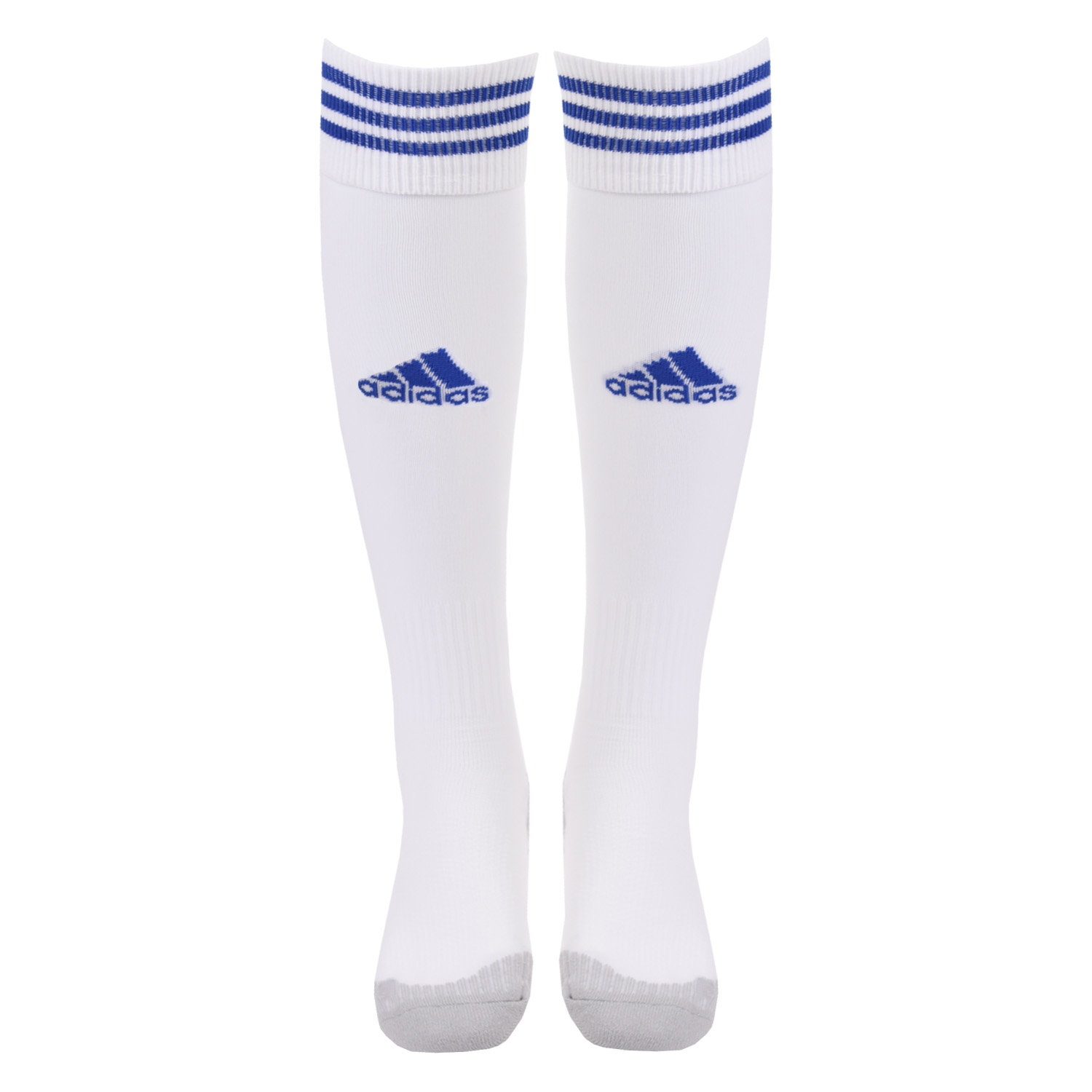 The predominantly white away shirt is completed with royal blue three stripe detailing, sleeve accents and sponsor logo. The shorts and socks are also both white with blue contrast trim.