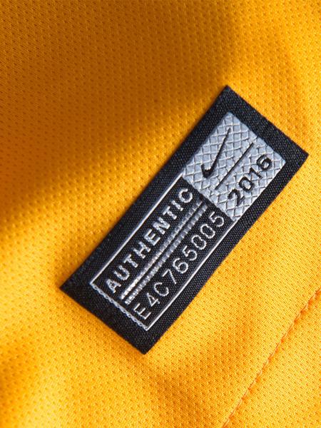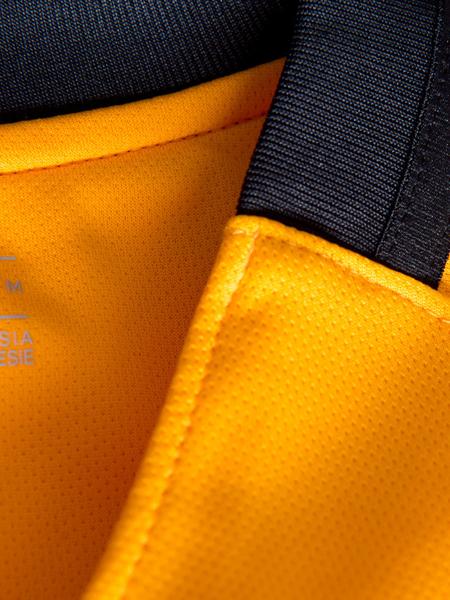 The gold kit features a solid black stripe which runs down the sides of the jersey and shorts, with a half black stripe completing the back of the v-neck collar. The socks are gold with a distinctive black linear pattern on the calf.
