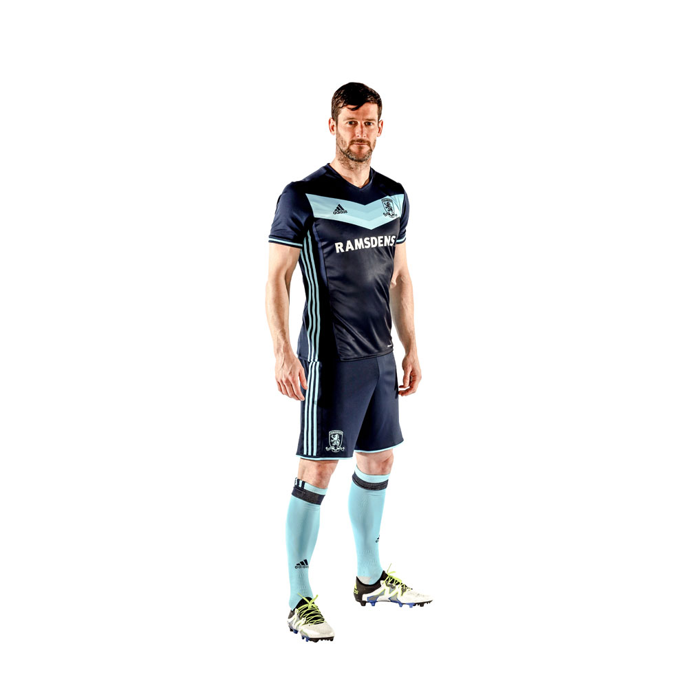 The Boro crest features in bright cyan to complement the shirt, teamed with a matching night navy indigo short which also features a bright cyan crest, matching bright cyan socks with an indigo trim and 3 stripe execution.