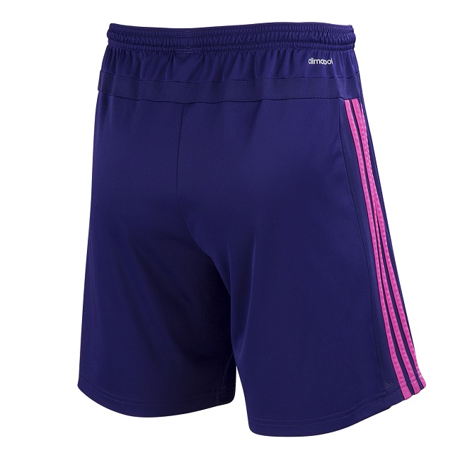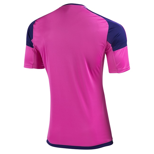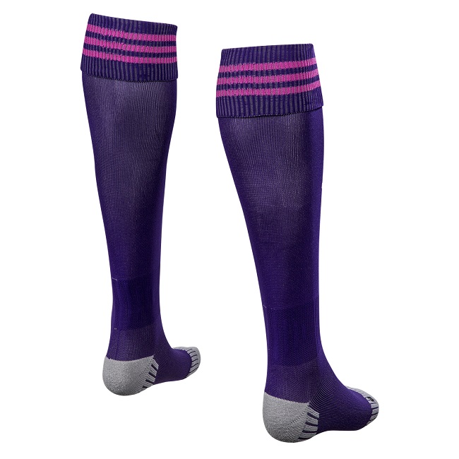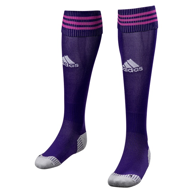 The shorts and socks complement the dynamic shirt design, with deep purple with pink detailing and trim.
