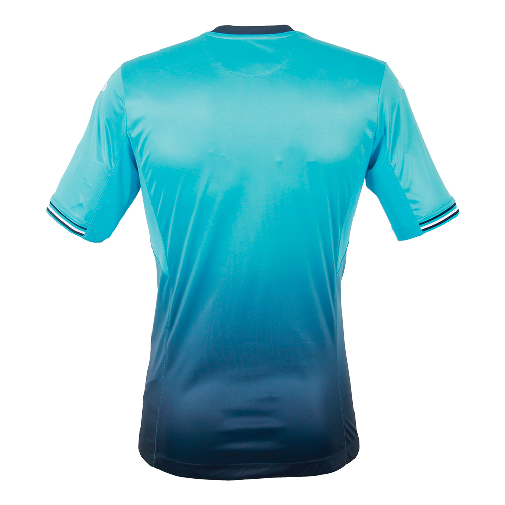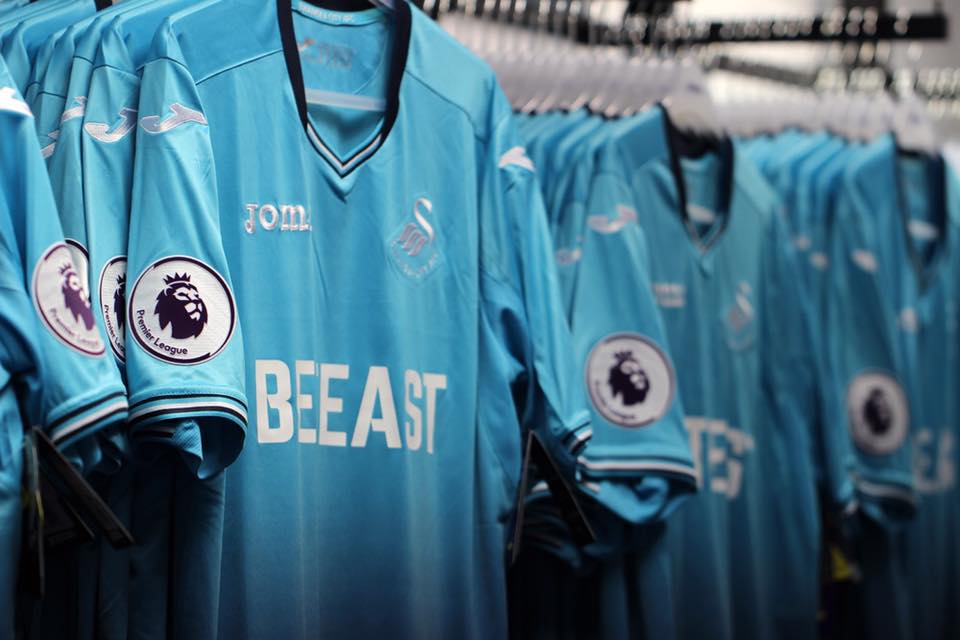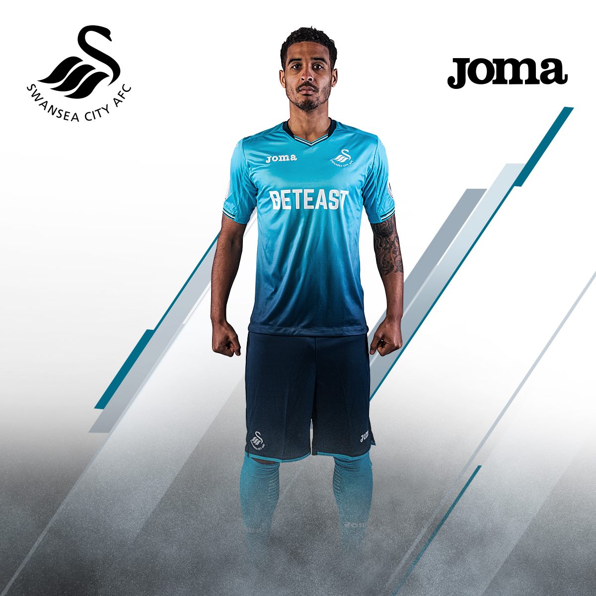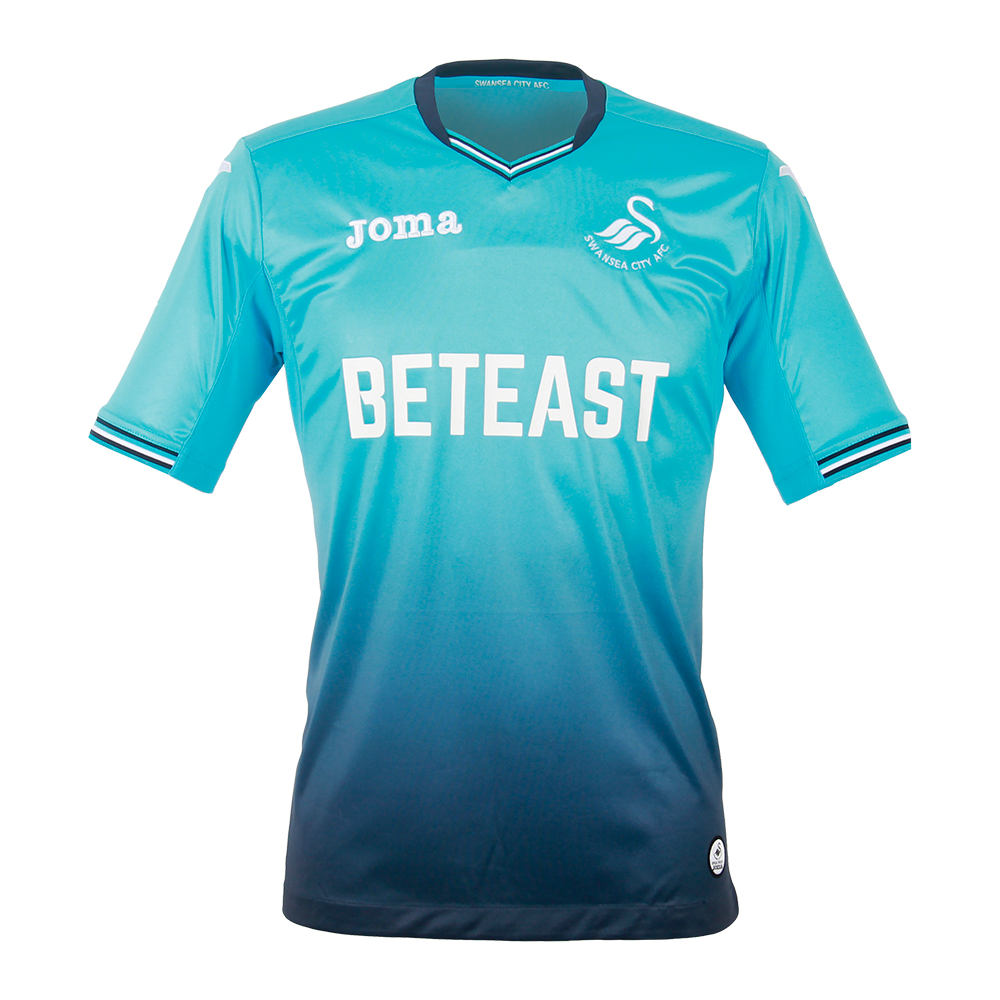 Custom-made for the Swans by the Spanish sports manufacturer, the away kit flows from turquoise to navy, with white badges and a navy trim, navy shorts and turquoise socks.