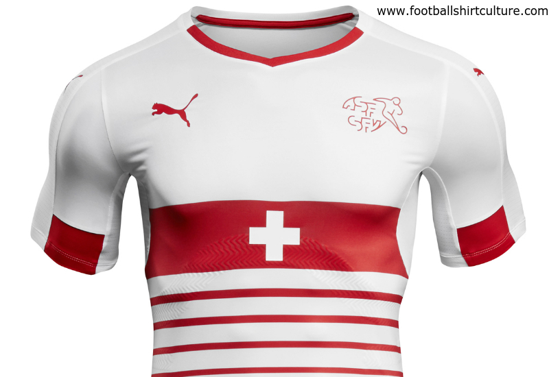 Stepping away from Switzerland's traditional away designs of previous years, the new kit shows off a new and unique design. The shirt body features a horizontal stripe pattern that starts with the bold red chest band, which has the Swiss white cross placed centrally.