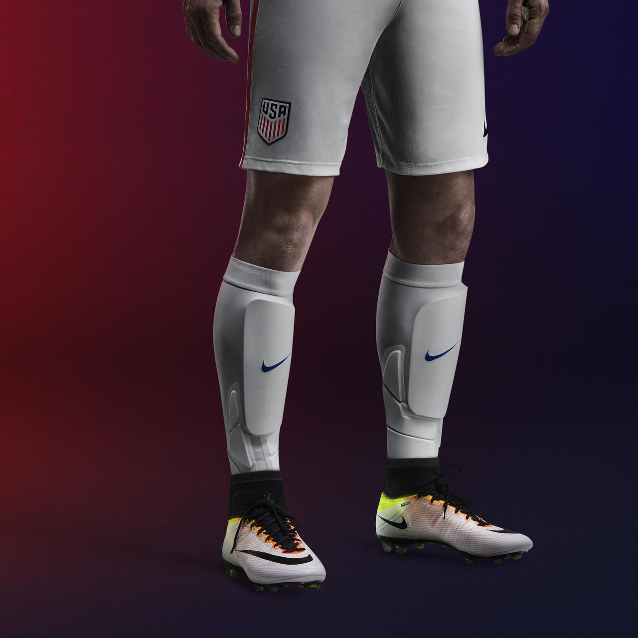 New white NikeGRIP socks with a linear blue graphic on the calf highlight the most dynamic part of the footballer’s body, the lower legs, to accentuate speed. They also pair with new Nike Hyperstrong Match Sleeves. Modified to today’s game, the new sleeve incorporates additional ankle reinforcements and protection pads in high-risk areas, without inhibiting agility.