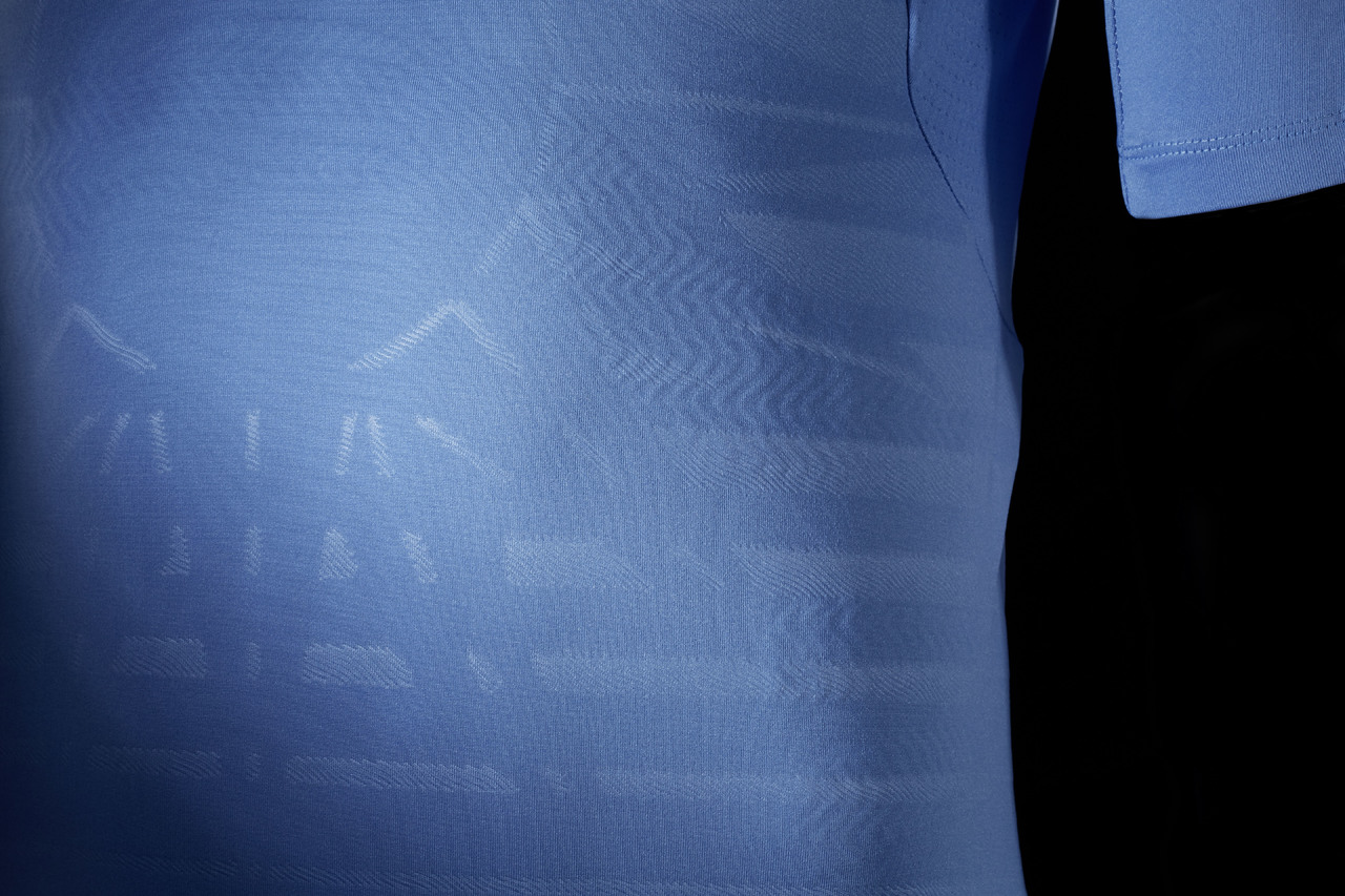 The eye-catching feature of the blue home jersey is the embossed “Sun of May” symbol that covers the front. Taken from the Uruguayan flag, the face and rays of the sun are stretched across the chest.