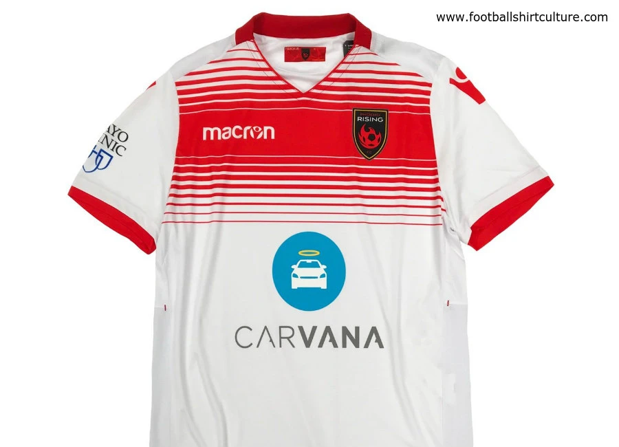 This is the new Phoenix Rising FC 2018 Away football shirt by macron. The away shirt is a round neck, white shirt with red detailing and red bands across the chest while the shorts and socks are...