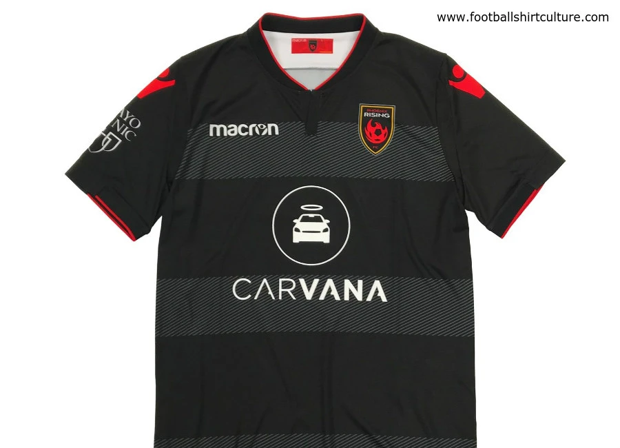 This is the new Phoenix Rising FC 2018 Third football shirt by macron. The third shirt is black with dark grey sublimation of diagonal pinstripes giving the impression of wide tone on tone hoops...