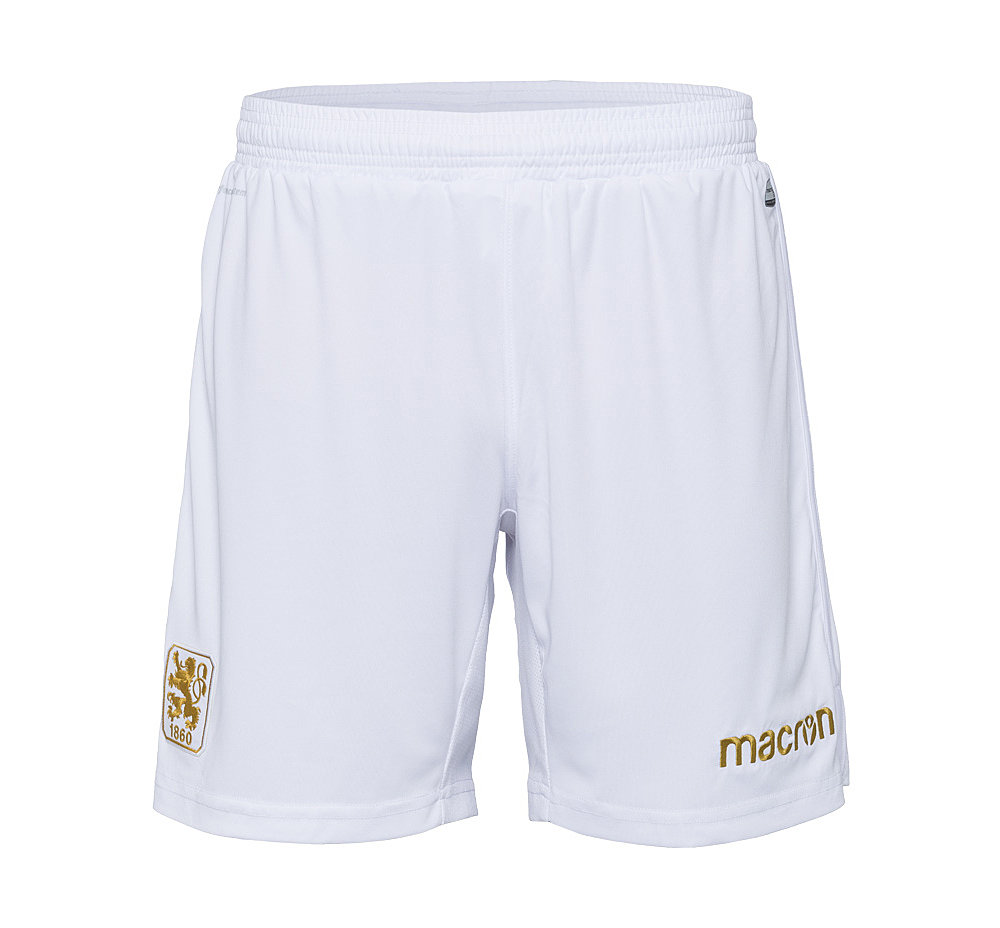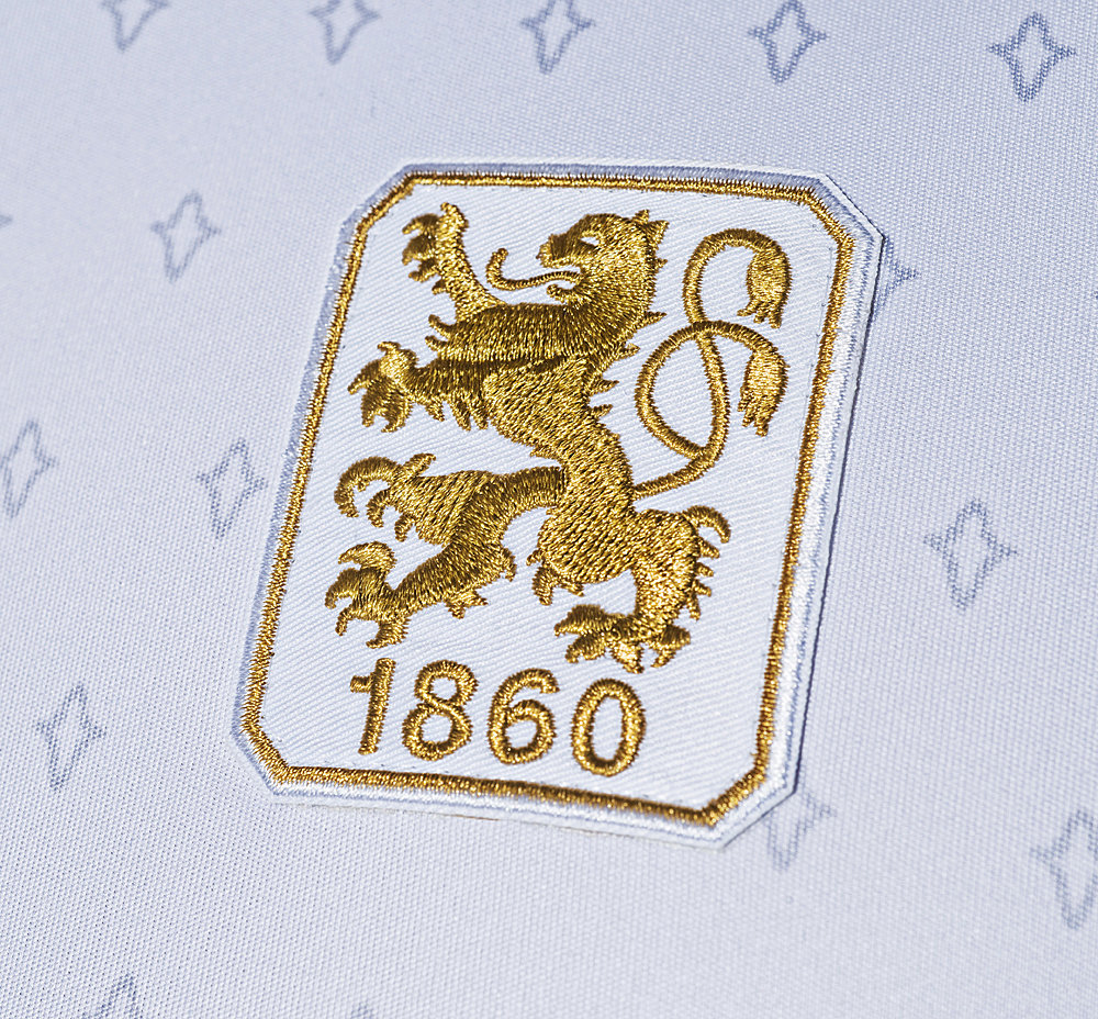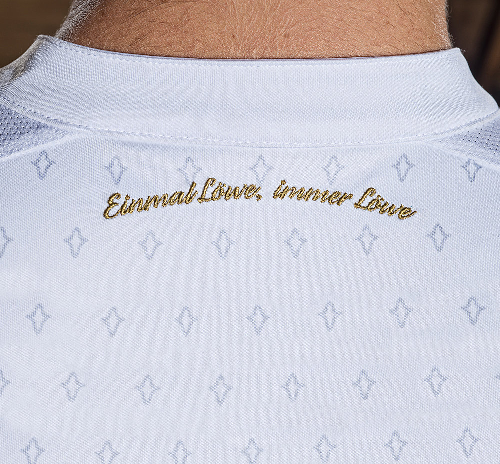 The Macron Man is printed in gold on the upper sleeves. The Macron logo is embroidered in gold on the top right-hand side. On the left, the Monaco 1860 patch is embroidered in gold. On the back of the shirt, just under the neck, it has “Einmal Löwe, immer Löwe” embroidered in gold.