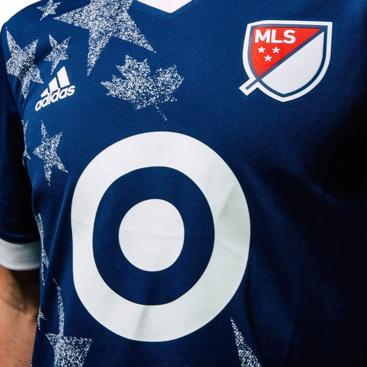 The MLS-based players will wear a navy blue shirt with white trimming on the sleeves and collar, but the most unique aspect of the top will be the large stars and maple leafs that run down from the right shoulder.